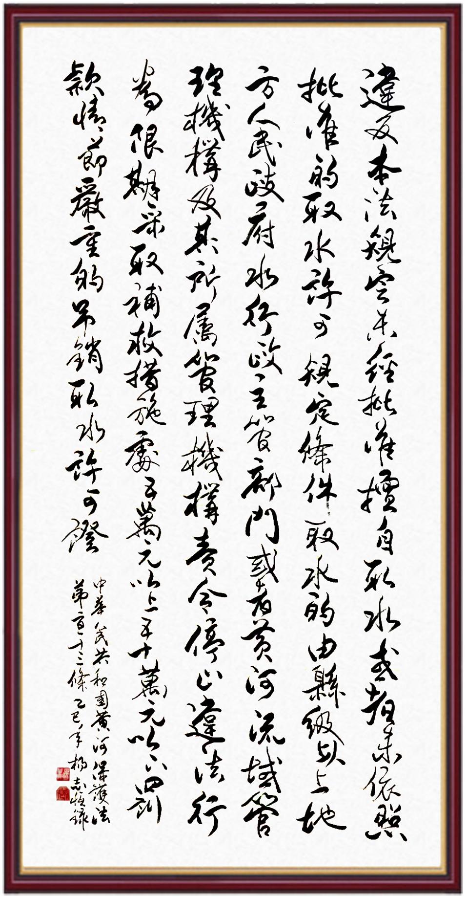 黃河寧,天下平。黃河是中華民族的發(fā)源地和搖籃,保護(hù)黃河是事關(guān)中華民族偉大復(fù)興的千秋大計(jì)?!吨腥A人民共和國黃河保護(hù)法》為推進(jìn)水資源節(jié)約集約利用、保護(hù)傳承弘揚(yáng)黃河文化、推動黃河流域生態(tài)保護(hù)和高質(zhì)量發(fā)展提供了有力法治保障。繼書寫《中華人民共和國民法典》《中華人民共和國憲法》《中華人民共和國澳門特別行政區(qū)基本法》《中華人民共和國香港特別行政區(qū)基本法》《中華人民共和國國旗法》《中華人民共和國國徽法》《中華人民共和國國歌法》《中華人民共和國法官法》等法律法規(guī)之后,法制日報(bào)社聯(lián)合沿黃九?。▍^(qū))司法廳、書法家協(xié)會,將筆端對準(zhǔn)《中華人民共和國黃河保護(hù)法》。