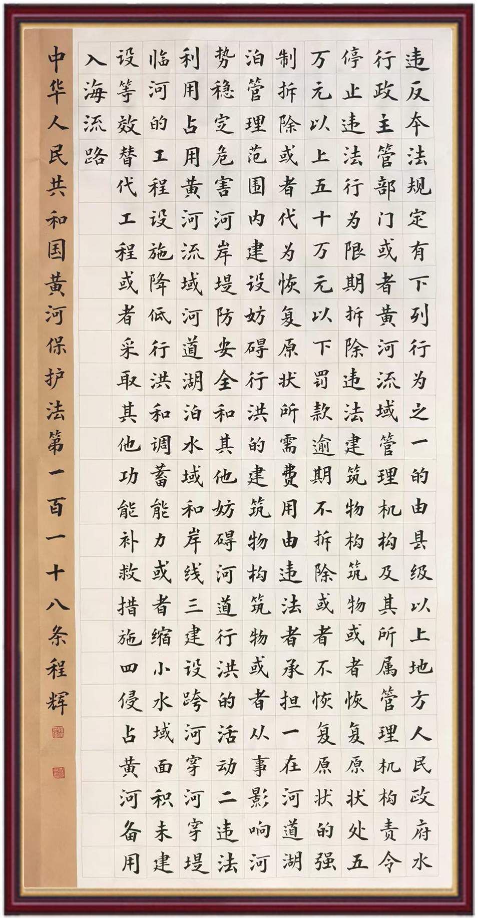 黃河寧,天下平。黃河是中華民族的發(fā)源地和搖籃,保護黃河是事關中華民族偉大復興的千秋大計。《中華人民共和國黃河保護法》為推進水資源節(jié)約集約利用、保護傳承弘揚黃河文化、推動黃河流域生態(tài)保護和高質量發(fā)展提供了有力法治保障。繼書寫《中華人民共和國民法典》《中華人民共和國憲法》《中華人民共和國澳門特別行政區(qū)基本法》《中華人民共和國香港特別行政區(qū)基本法》《中華人民共和國國旗法》《中華人民共和國國徽法》《中華人民共和國國歌法》《中華人民共和國法官法》等法律法規(guī)之后,法制日報社聯合沿黃九?。▍^(qū))司法廳、書法家協會,將筆端對準《中華人民共和國黃河保護法》。