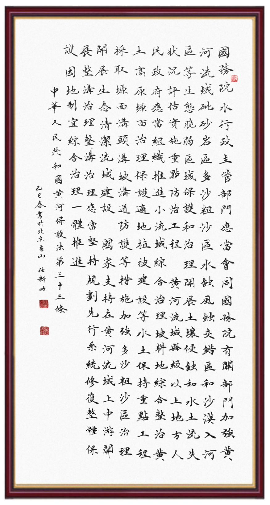 黃河寧,天下平。黃河是中華民族的發(fā)源地和搖籃,保護黃河是事關(guān)中華民族偉大復(fù)興的千秋大計?!吨腥A人民共和國黃河保護法》為推進水資源節(jié)約集約利用、保護傳承弘揚黃河文化、推動黃河流域生態(tài)保護和高質(zhì)量發(fā)展提供了有力法治保障。繼書寫《中華人民共和國民法典》《中華人民共和國憲法》《中華人民共和國澳門特別行政區(qū)基本法》《中華人民共和國香港特別行政區(qū)基本法》《中華人民共和國國旗法》《中華人民共和國國徽法》《中華人民共和國國歌法》《中華人民共和國法官法》等法律法規(guī)之后,法制日報社聯(lián)合沿黃九?。▍^(qū))司法廳、書法家協(xié)會,將筆端對準《中華人民共和國黃河保護法》。