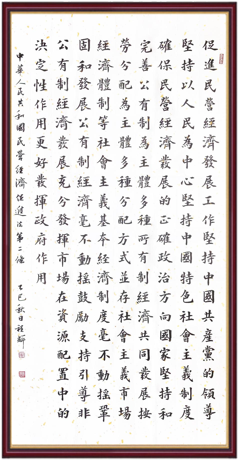 《中華人民共和國民營經(jīng)濟(jì)促進(jìn)法》自今年5月20日起施行。作為我國首部專門關(guān)于民營經(jīng)濟(jì)發(fā)展的基礎(chǔ)性法律,民營經(jīng)濟(jì)促進(jìn)法將支持和保障民營經(jīng)濟(jì)發(fā)展的法律制度融入中國特色社會(huì)主義法律體系,具有重大的法治意義,為促進(jìn)民營經(jīng)濟(jì)持續(xù)、健康、高質(zhì)量發(fā)展提供了堅(jiān)實(shí)的法治保障。為更好地學(xué)習(xí)、宣傳、貫徹這部法律,法治日?qǐng)?bào)社聯(lián)合司法部普法與依法治理局,開展“‘書·法’系列活動(dòng)之書寫《中華人民共和國民營經(jīng)濟(jì)促進(jìn)法》”活動(dòng)。