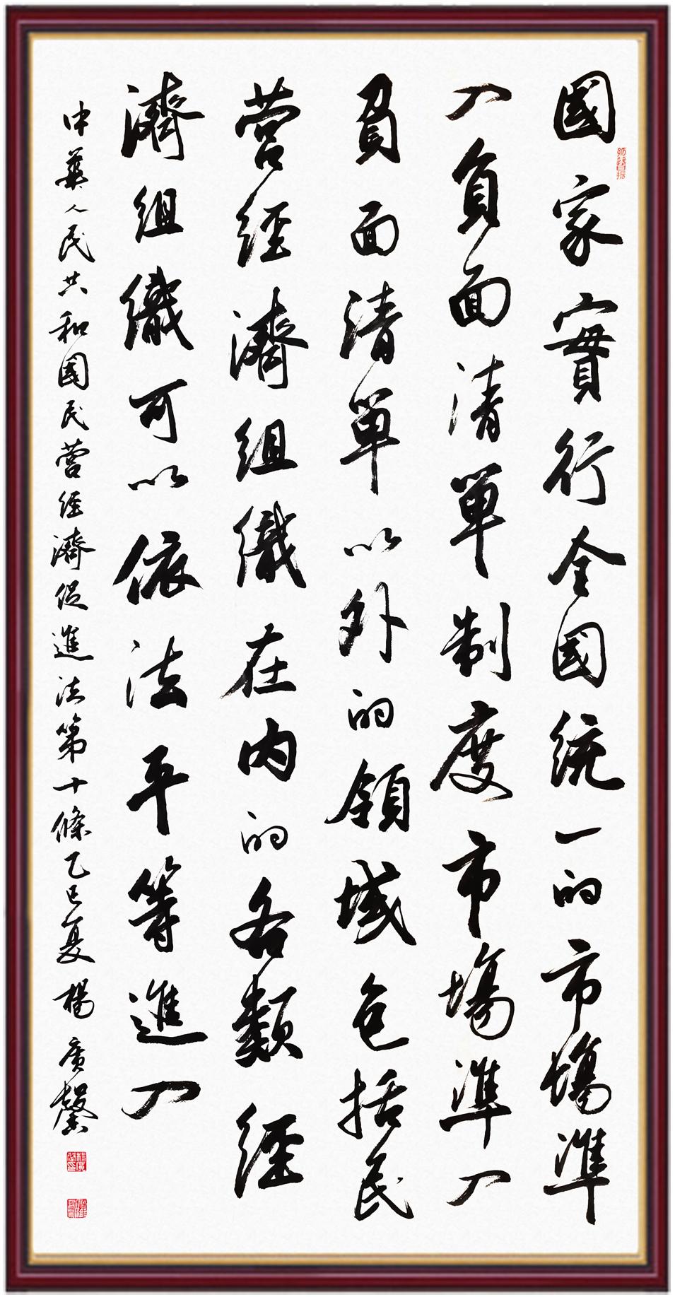 《中華人民共和國民營經(jīng)濟(jì)促進(jìn)法》自今年5月20日起施行。作為我國首部專門關(guān)于民營經(jīng)濟(jì)發(fā)展的基礎(chǔ)性法律,民營經(jīng)濟(jì)促進(jìn)法將支持和保障民營經(jīng)濟(jì)發(fā)展的法律制度融入中國特色社會(huì)主義法律體系,具有重大的法治意義,為促進(jìn)民營經(jīng)濟(jì)持續(xù)、健康、高質(zhì)量發(fā)展提供了堅(jiān)實(shí)的法治保障。為更好地學(xué)習(xí)、宣傳、貫徹這部法律,法治日?qǐng)?bào)社聯(lián)合司法部普法與依法治理局,開展“‘書·法’系列活動(dòng)之書寫《中華人民共和國民營經(jīng)濟(jì)促進(jìn)法》”活動(dòng)。