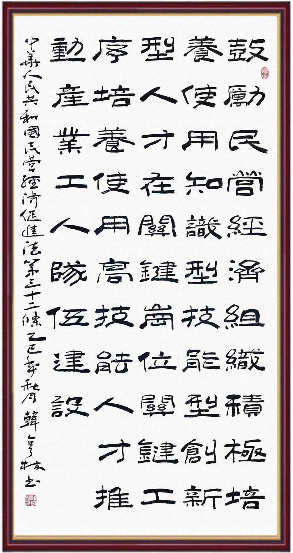 《中華人民共和國民營經(jīng)濟促進法》自今年5月20日起施行。作為我國首部專門關(guān)于民營經(jīng)濟發(fā)展的基礎性法律,民營經(jīng)濟促進法將支持和保障民營經(jīng)濟發(fā)展的法律制度融入中國特色社會主義法律體系,具有重大的法治意義,為促進民營經(jīng)濟持續(xù)、健康、高質(zhì)量發(fā)展提供了堅實的法治保障。為更好地學習、宣傳、貫徹這部法律,法治日報社聯(lián)合司法部普法與依法治理局,開展“‘書·法’系列活動之書寫《中華人民共和國民營經(jīng)濟促進法》”活動。