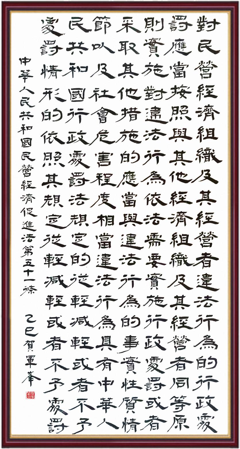 《中華人民共和國民營經(jīng)濟(jì)促進(jìn)法》自今年5月20日起施行。作為我國首部專門關(guān)于民營經(jīng)濟(jì)發(fā)展的基礎(chǔ)性法律,民營經(jīng)濟(jì)促進(jìn)法將支持和保障民營經(jīng)濟(jì)發(fā)展的法律制度融入中國特色社會主義法律體系,具有重大的法治意義,為促進(jìn)民營經(jīng)濟(jì)持續(xù)、健康、高質(zhì)量發(fā)展提供了堅(jiān)實(shí)的法治保障。為更好地學(xué)習(xí)、宣傳、貫徹這部法律,法治日報(bào)社聯(lián)合司法部普法與依法治理局,開展“‘書·法’系列活動之書寫《中華人民共和國民營經(jīng)濟(jì)促進(jìn)法》”活動。
