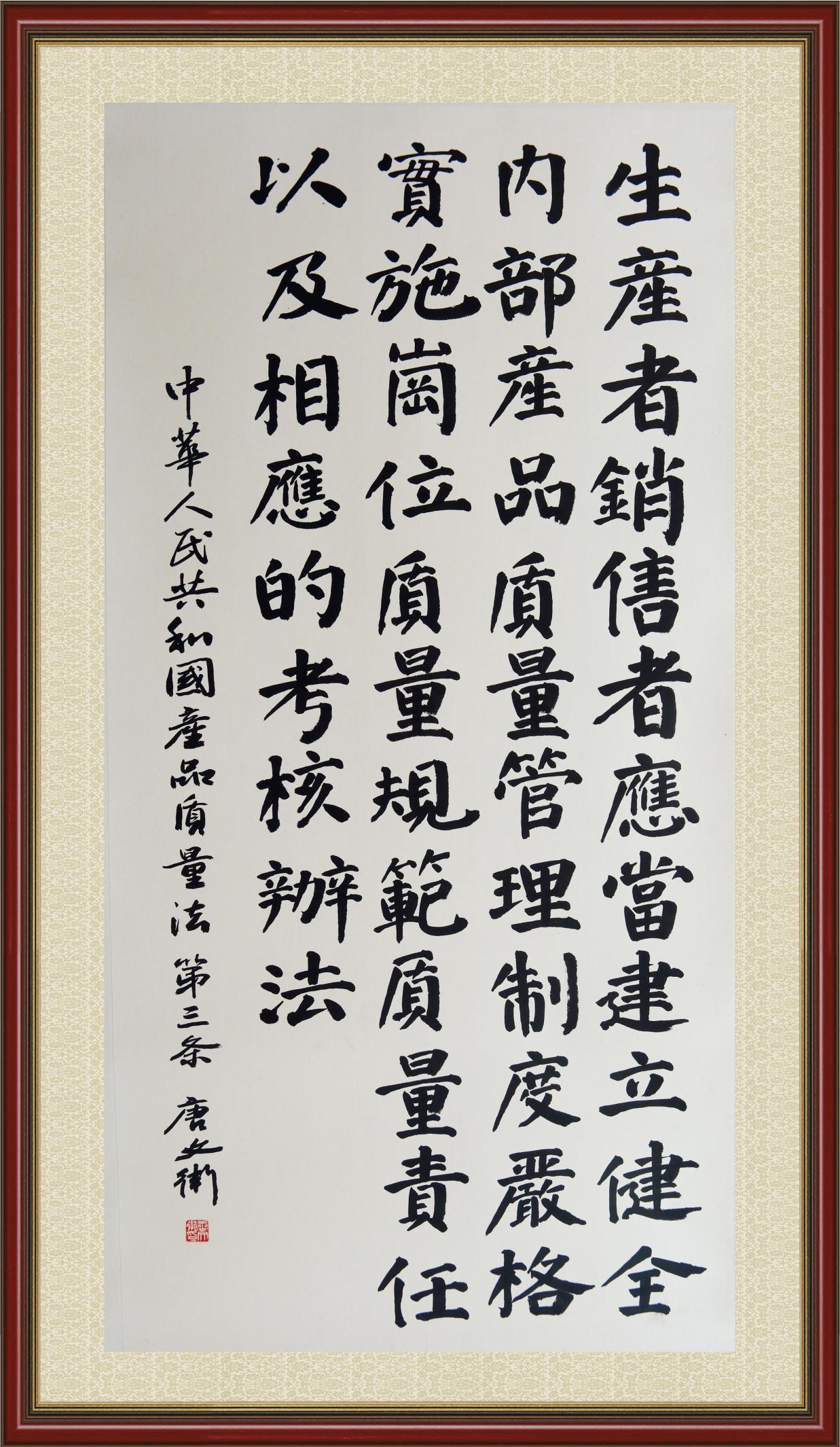 《中華人民共和國產(chǎn)品質(zhì)量法》自1993年9月1日起開始施行,先后進行三次修正。作為產(chǎn)品質(zhì)量領域的基本法律,產(chǎn)品質(zhì)量法對規(guī)范產(chǎn)品質(zhì)量管理、維護消費者合法權益、促進經(jīng)濟社會發(fā)展具有重要意義。為更好地學習、宣傳、貫徹這部法律,在國家市場監(jiān)督管理總局法規(guī)司的支持下,法治日報社開展了“‘書·法’系列活動之書寫《中華人民共和國產(chǎn)品質(zhì)量法》”活動。