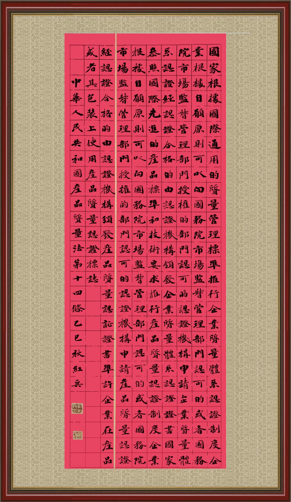 《中華人民共和國產(chǎn)品質(zhì)量法》自1993年9月1日起開始施行,先后進(jìn)行三次修正。作為產(chǎn)品質(zhì)量領(lǐng)域的基本法律,產(chǎn)品質(zhì)量法對規(guī)范產(chǎn)品質(zhì)量管理、維護(hù)消費(fèi)者合法權(quán)益、促進(jìn)經(jīng)濟(jì)社會發(fā)展具有重要意義。為更好地學(xué)習(xí)、宣傳、貫徹這部法律,在國家市場監(jiān)督管理總局法規(guī)司的支持下,法治日報社開展了“‘書·法’系列活動之書寫《中華人民共和國產(chǎn)品質(zhì)量法》”活動。