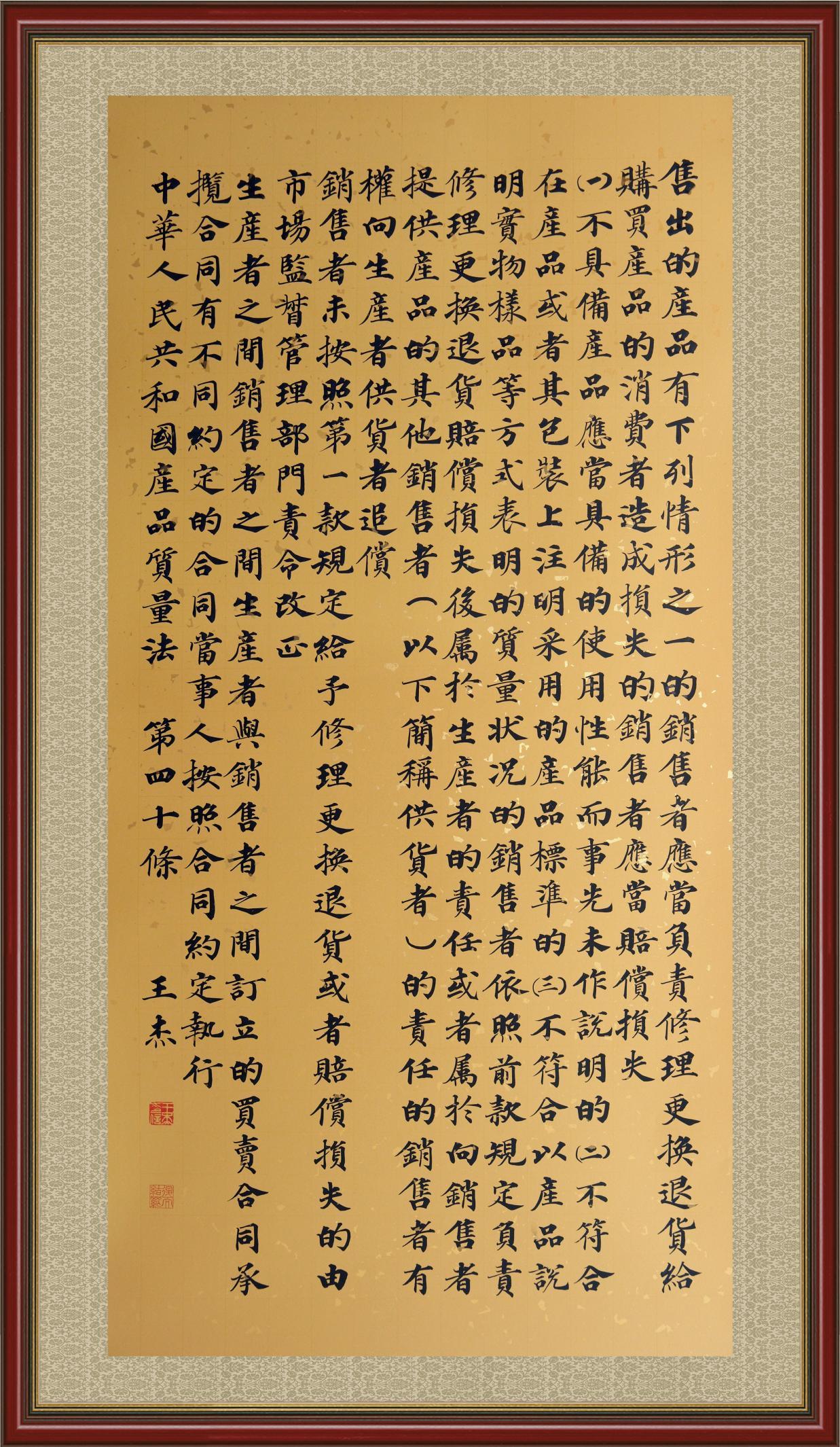 《中華人民共和國(guó)產(chǎn)品質(zhì)量法》自1993年9月1日起開(kāi)始施行,先后進(jìn)行三次修正。作為產(chǎn)品質(zhì)量領(lǐng)域的基本法律,產(chǎn)品質(zhì)量法對(duì)規(guī)范產(chǎn)品質(zhì)量管理、維護(hù)消費(fèi)者合法權(quán)益、促進(jìn)經(jīng)濟(jì)社會(huì)發(fā)展具有重要意義。為更好地學(xué)習(xí)、宣傳、貫徹這部法律,在國(guó)家市場(chǎng)監(jiān)督管理總局法規(guī)司的支持下,法治日?qǐng)?bào)社開(kāi)展了“‘書(shū)·法’系列活動(dòng)之書(shū)寫(xiě)《中華人民共和國(guó)產(chǎn)品質(zhì)量法》”活動(dòng)。