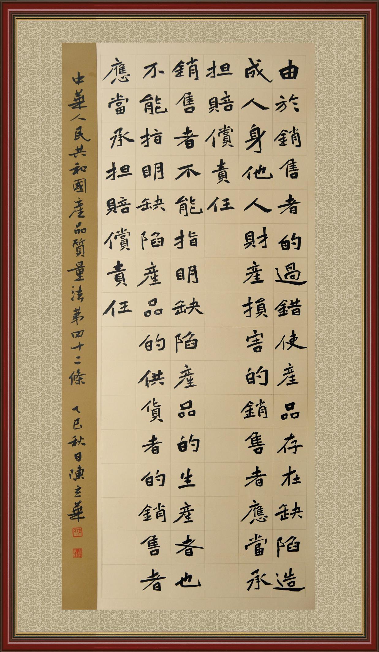 《中華人民共和國產(chǎn)品質(zhì)量法》自1993年9月1日起開始施行,先后進行三次修正。作為產(chǎn)品質(zhì)量領(lǐng)域的基本法律,產(chǎn)品質(zhì)量法對規(guī)范產(chǎn)品質(zhì)量管理、維護消費者合法權(quán)益、促進經(jīng)濟社會發(fā)展具有重要意義。為更好地學(xué)習(xí)、宣傳、貫徹這部法律,在國家市場監(jiān)督管理總局法規(guī)司的支持下,法治日報社開展了“‘書·法’系列活動之書寫《中華人民共和國產(chǎn)品質(zhì)量法》”活動。