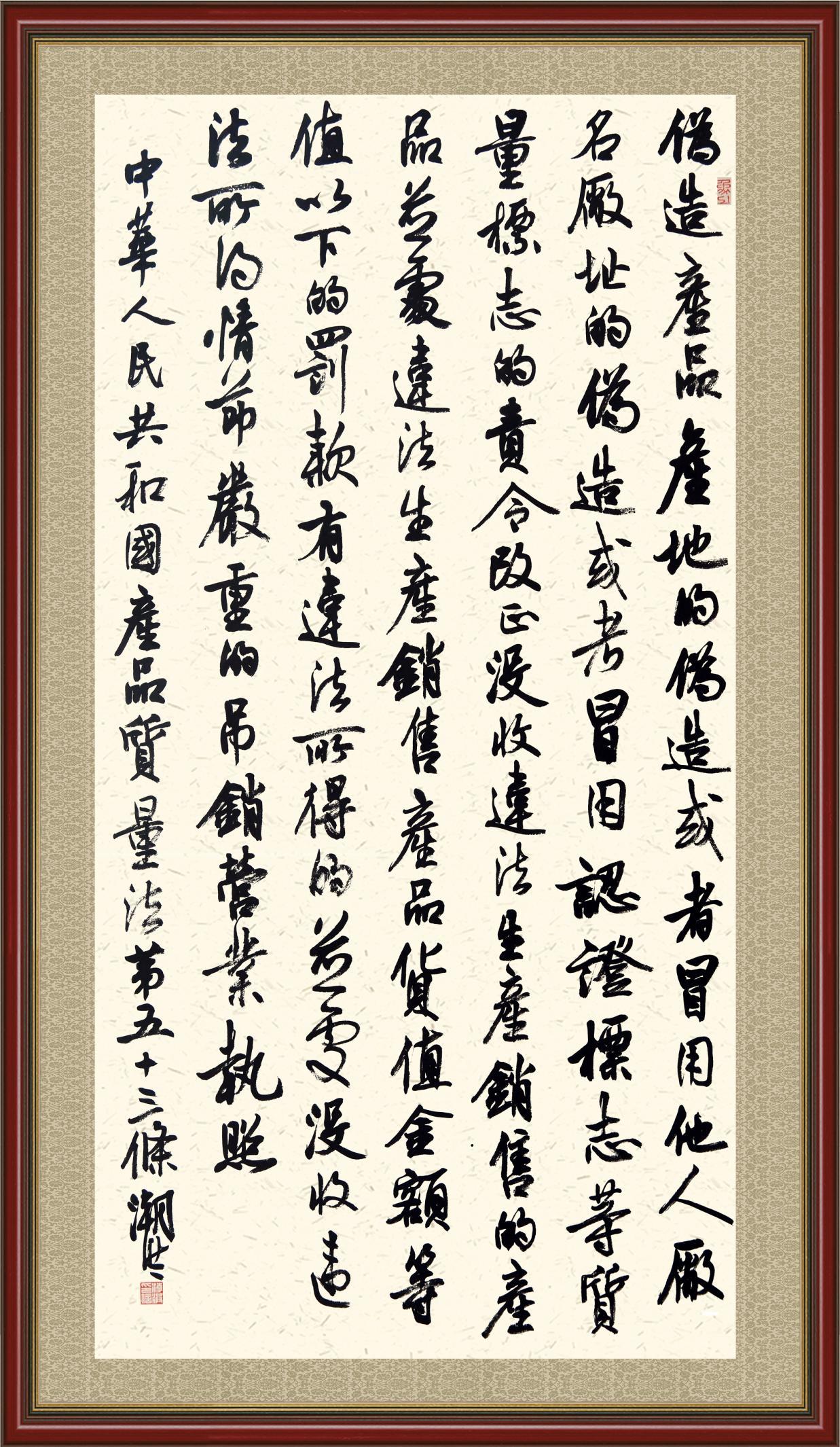 《中華人民共和國產(chǎn)品質量法》自1993年9月1日起開始施行,先后進行三次修正。作為產(chǎn)品質量領域的基本法律,產(chǎn)品質量法對規(guī)范產(chǎn)品質量管理、維護消費者合法權益、促進經(jīng)濟社會發(fā)展具有重要意義。為更好地學習、宣傳、貫徹這部法律,在國家市場監(jiān)督管理總局法規(guī)司的支持下,法治日報社開展了“‘書·法’系列活動之書寫《中華人民共和國產(chǎn)品質量法》”活動。