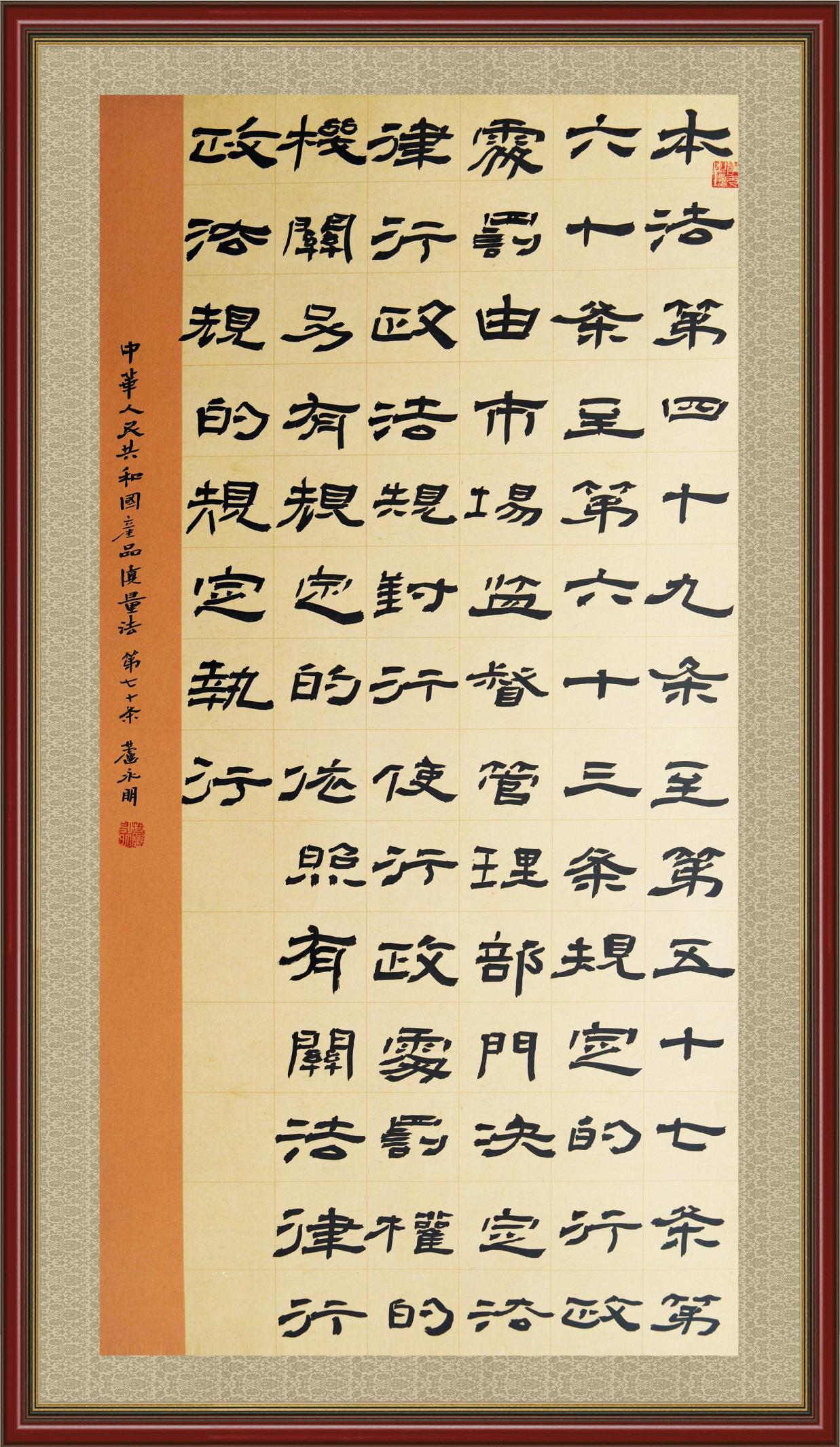 《中華人民共和國產(chǎn)品質(zhì)量法》自1993年9月1日起開始施行,先后進(jìn)行三次修正。作為產(chǎn)品質(zhì)量領(lǐng)域的基本法律,產(chǎn)品質(zhì)量法對規(guī)范產(chǎn)品質(zhì)量管理、維護(hù)消費者合法權(quán)益、促進(jìn)經(jīng)濟(jì)社會發(fā)展具有重要意義。為更好地學(xué)習(xí)、宣傳、貫徹這部法律,在國家市場監(jiān)督管理總局法規(guī)司的支持下,法治日報社開展了“‘書·法’系列活動之書寫《中華人民共和國產(chǎn)品質(zhì)量法》”活動。