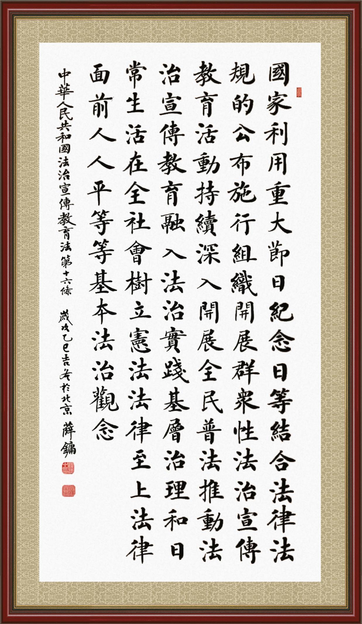 2020年7月11日,由法治日報社主辦的“書·法”系列活動正式啟動,先后書寫《中華人民共和國民法典》《中華人民共和國憲法》《中華人民共和國民營經(jīng)濟促進法》等21部法律法規(guī)。