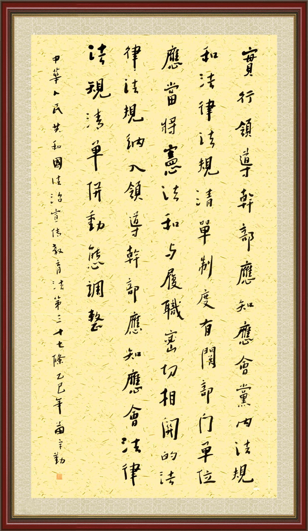 2020年7月11日,由法治日報社主辦的“書·法”系列活動正式啟動,先后書寫《中華人民共和國民法典》《中華人民共和國憲法》《中華人民共和國民營經(jīng)濟促進法》等21部法律法規(guī)。