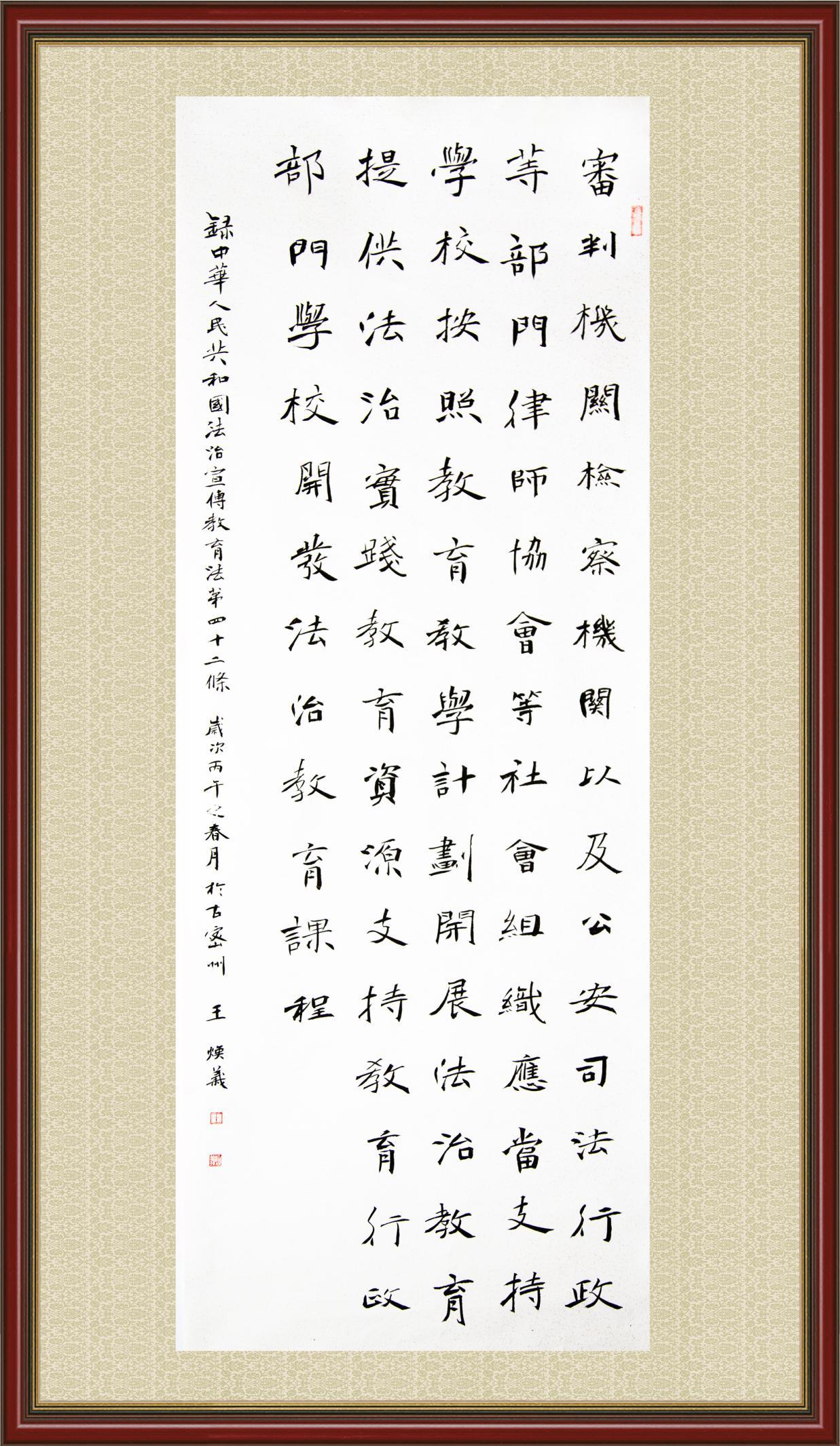 2020年7月11日,由法治日報社主辦的“書·法”系列活動正式啟動,先后書寫《中華人民共和國民法典》《中華人民共和國憲法》《中華人民共和國民營經(jīng)濟促進法》等21部法律法規(guī)。
