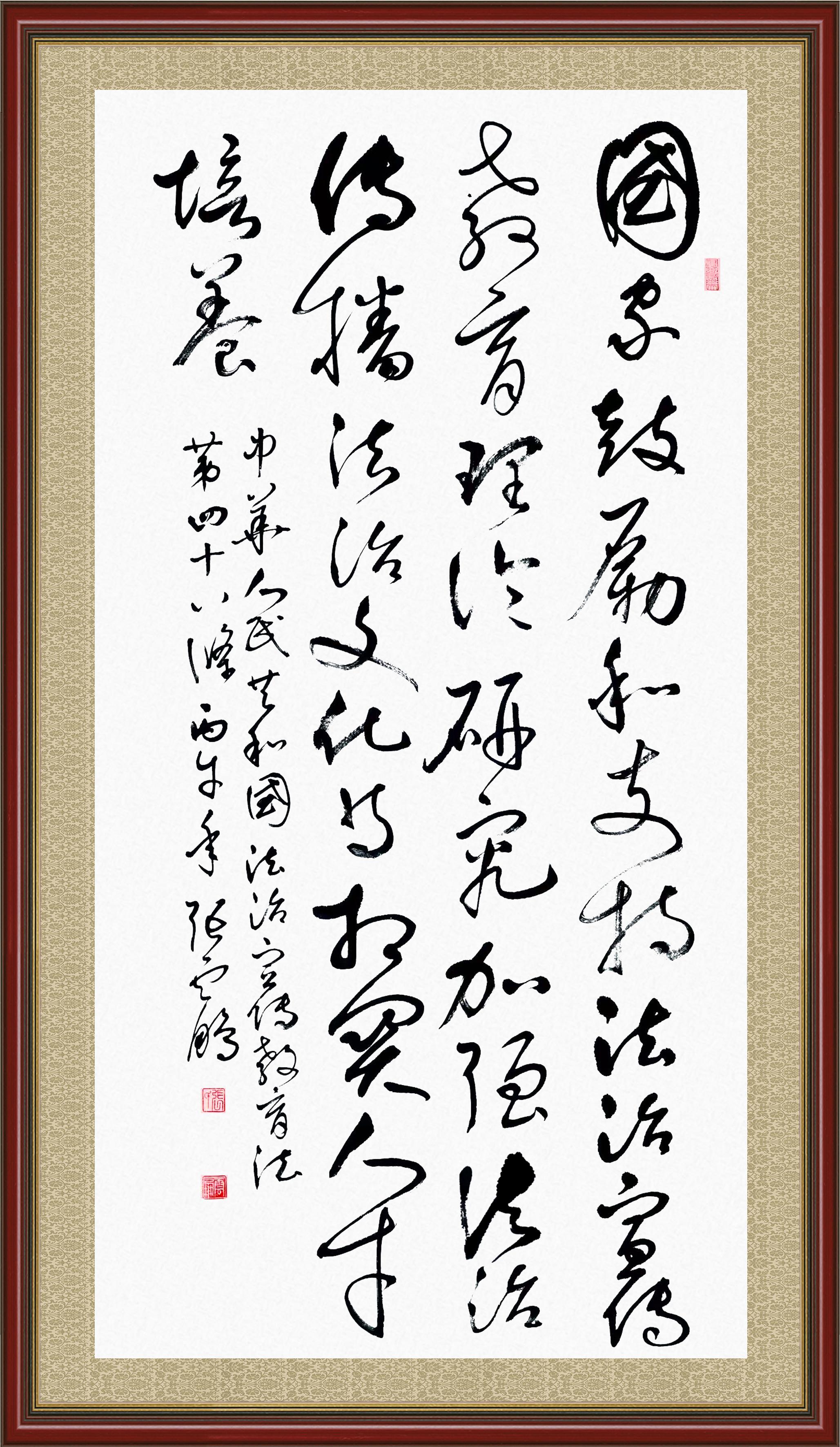 2020年7月11日,由法治日報社主辦的“書·法”系列活動正式啟動,先后書寫《中華人民共和國民法典》《中華人民共和國憲法》《中華人民共和國民營經(jīng)濟(jì)促進(jìn)法》等21部法律法規(guī)。