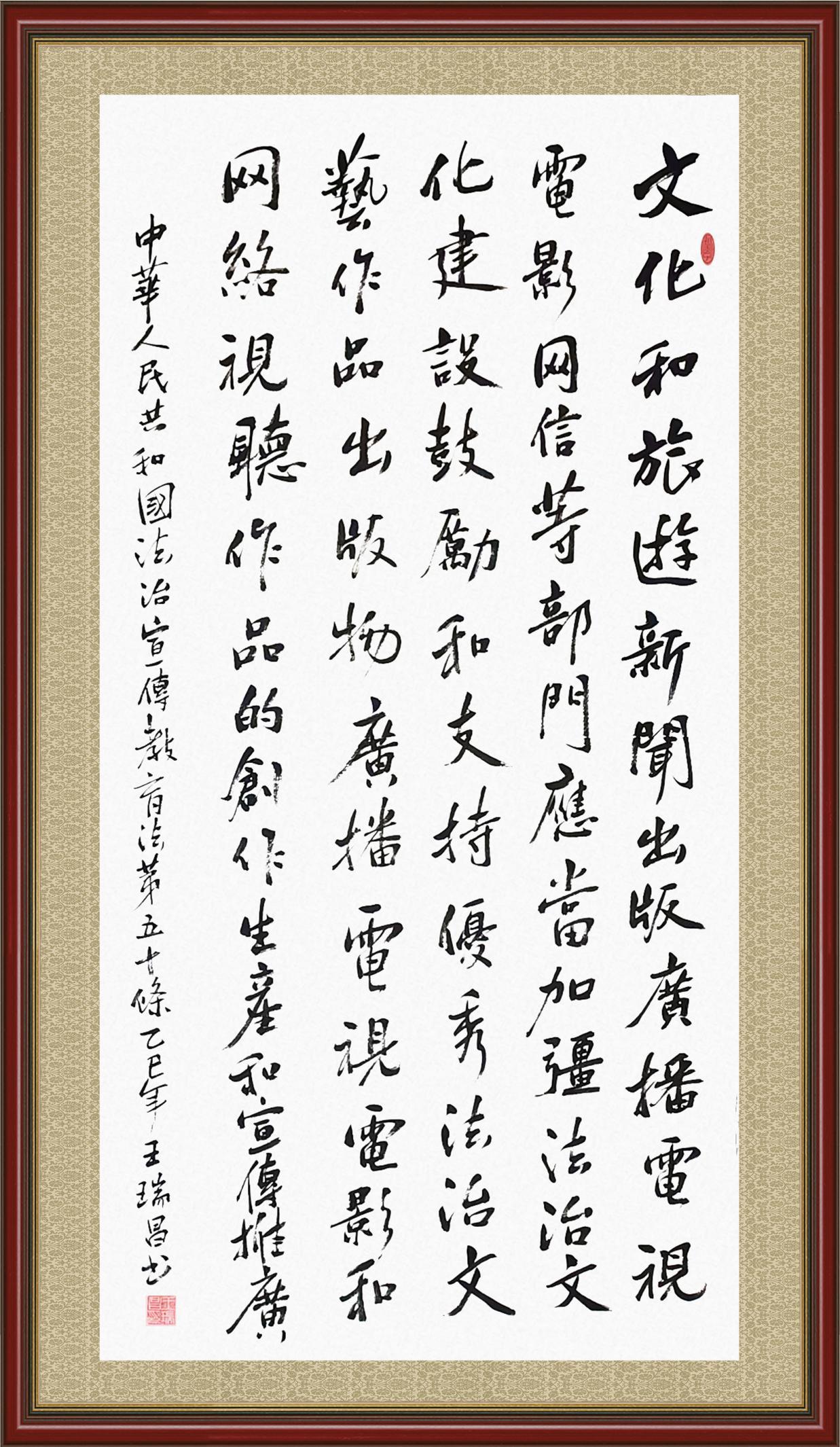 2020年7月11日,由法治日?qǐng)?bào)社主辦的“書·法”系列活動(dòng)正式啟動(dòng),先后書寫《中華人民共和國民法典》《中華人民共和國憲法》《中華人民共和國民營經(jīng)濟(jì)促進(jìn)法》等21部法律法規(guī)。