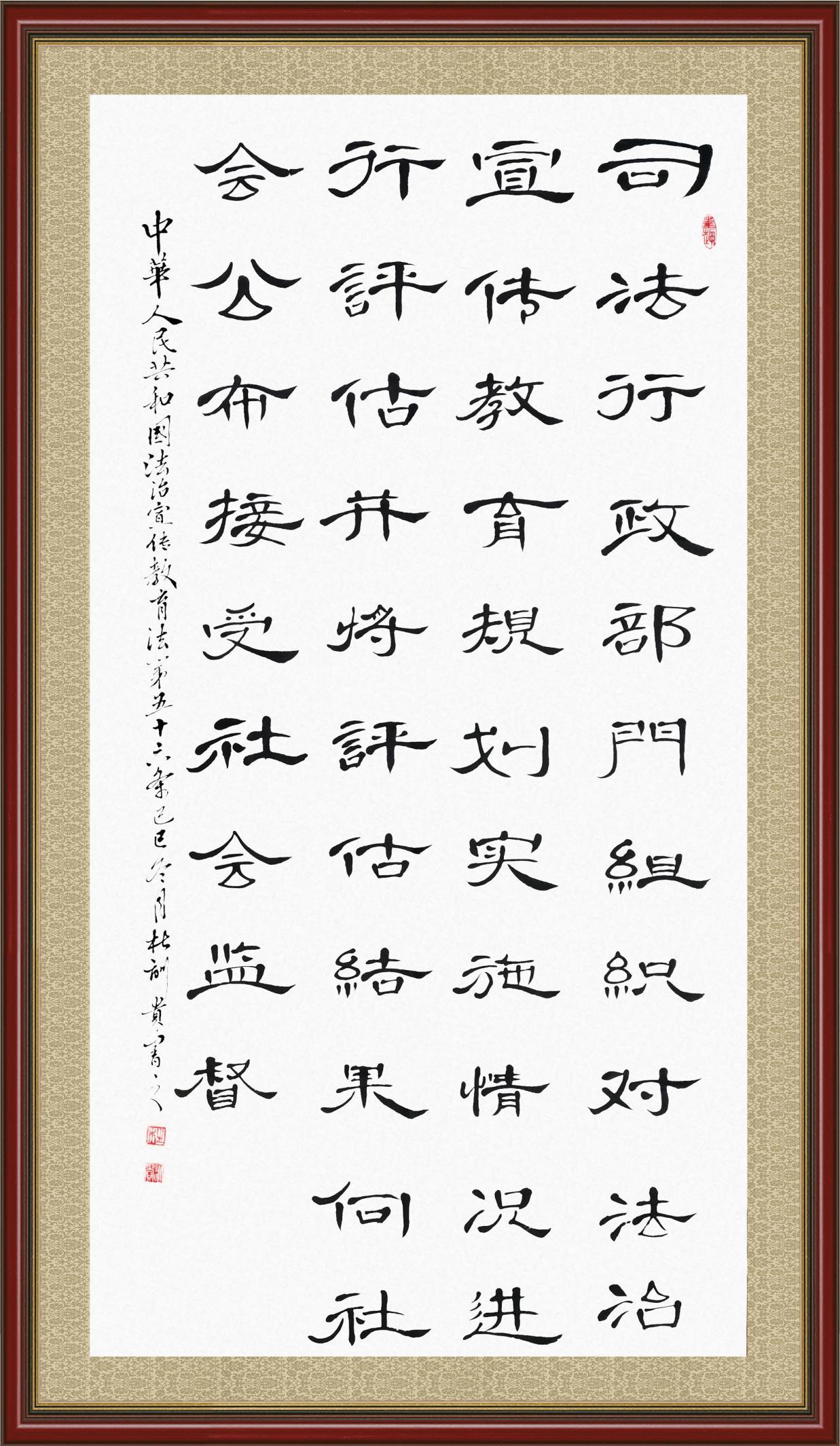 2020年7月11日,由法治日報(bào)社主辦的“書·法”系列活動(dòng)正式啟動(dòng),先后書寫《中華人民共和國民法典》《中華人民共和國憲法》《中華人民共和國民營經(jīng)濟(jì)促進(jìn)法》等21部法律法規(guī)。