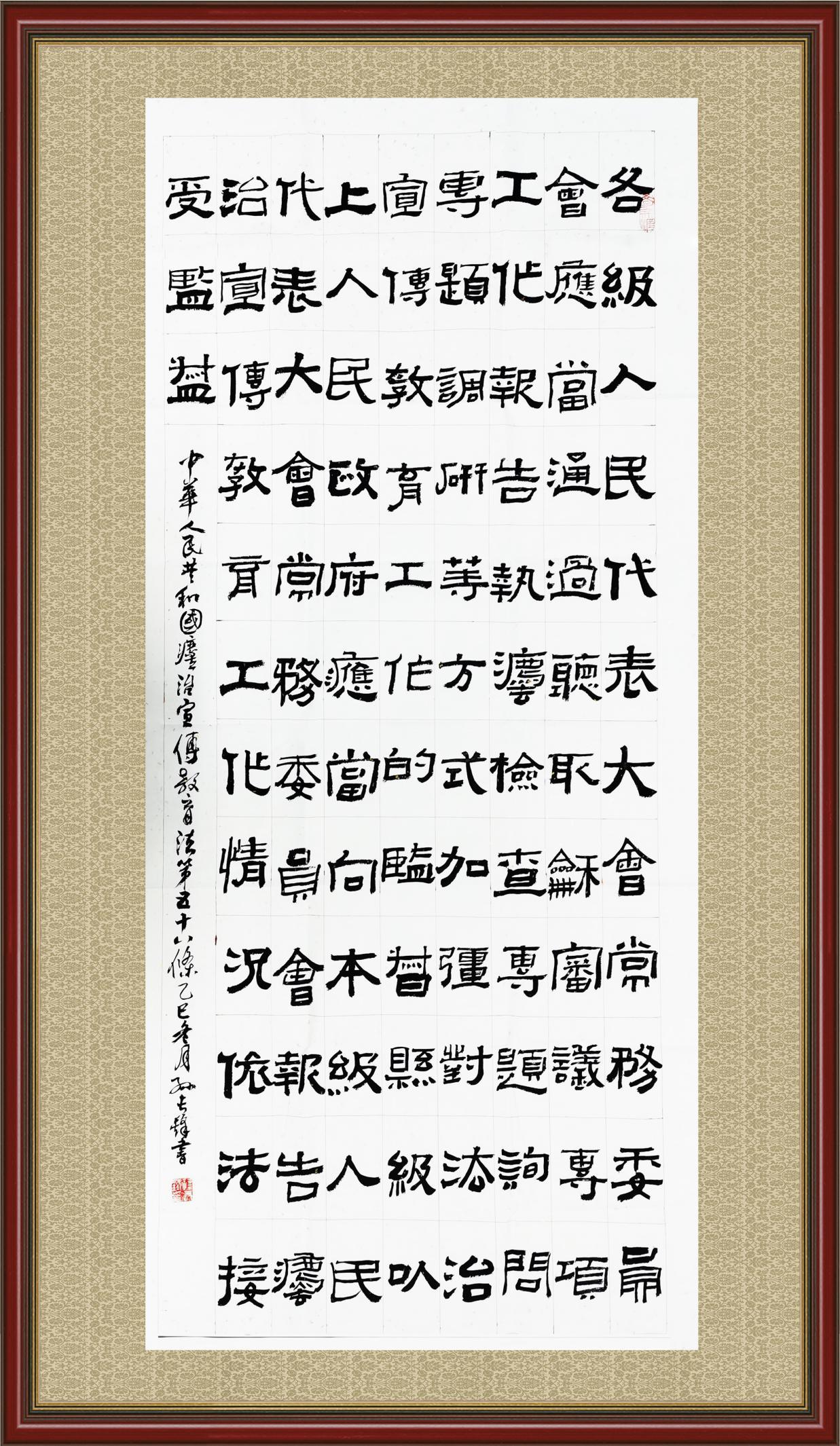 2020年7月11日,由法治日報社主辦的“書·法”系列活動正式啟動,先后書寫《中華人民共和國民法典》《中華人民共和國憲法》《中華人民共和國民營經(jīng)濟(jì)促進(jìn)法》等21部法律法規(guī)。