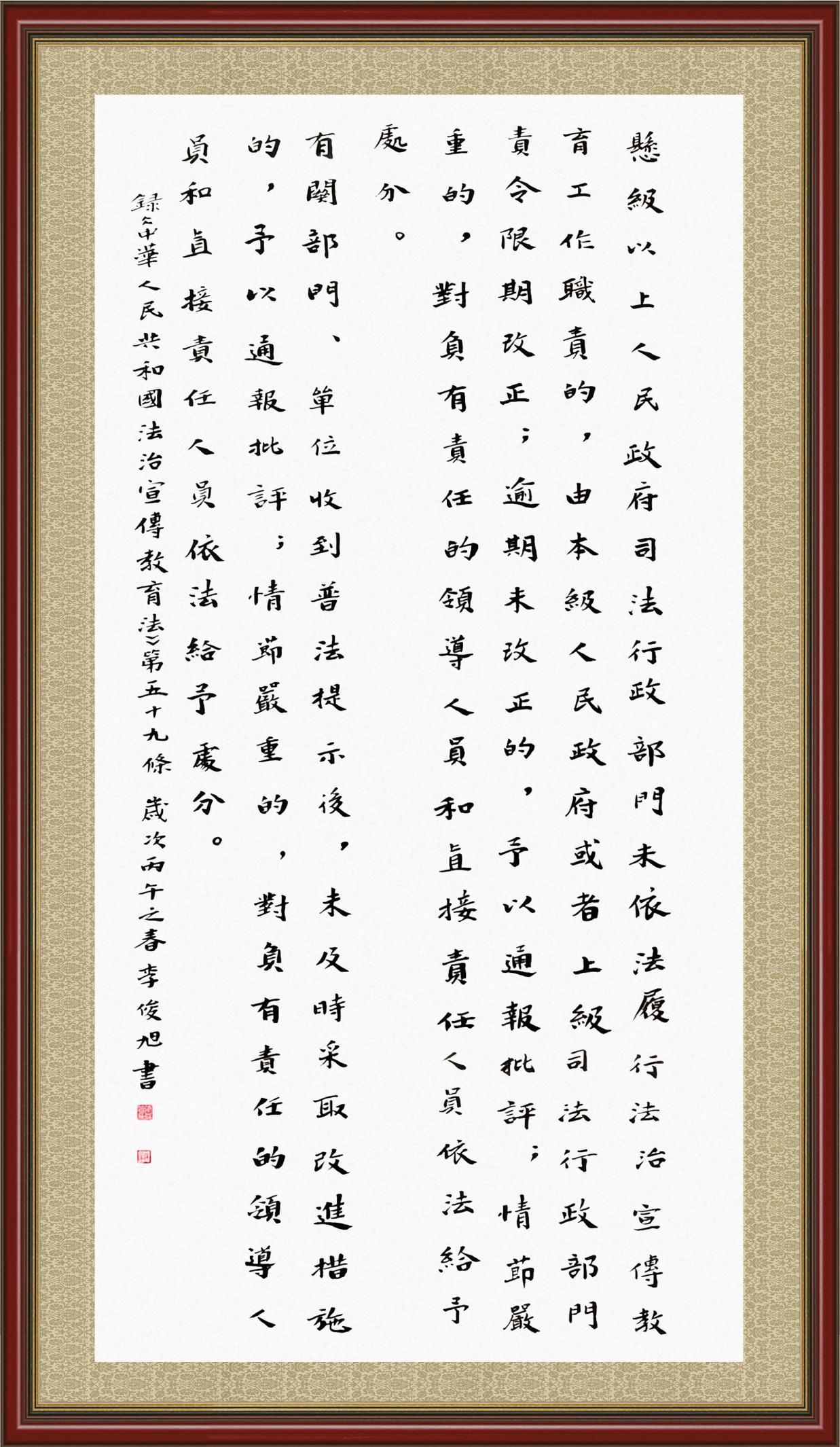 2020年7月11日,由法治日報社主辦的“書·法”系列活動正式啟動,先后書寫《中華人民共和國民法典》《中華人民共和國憲法》《中華人民共和國民營經(jīng)濟促進法》等21部法律法規(guī)。