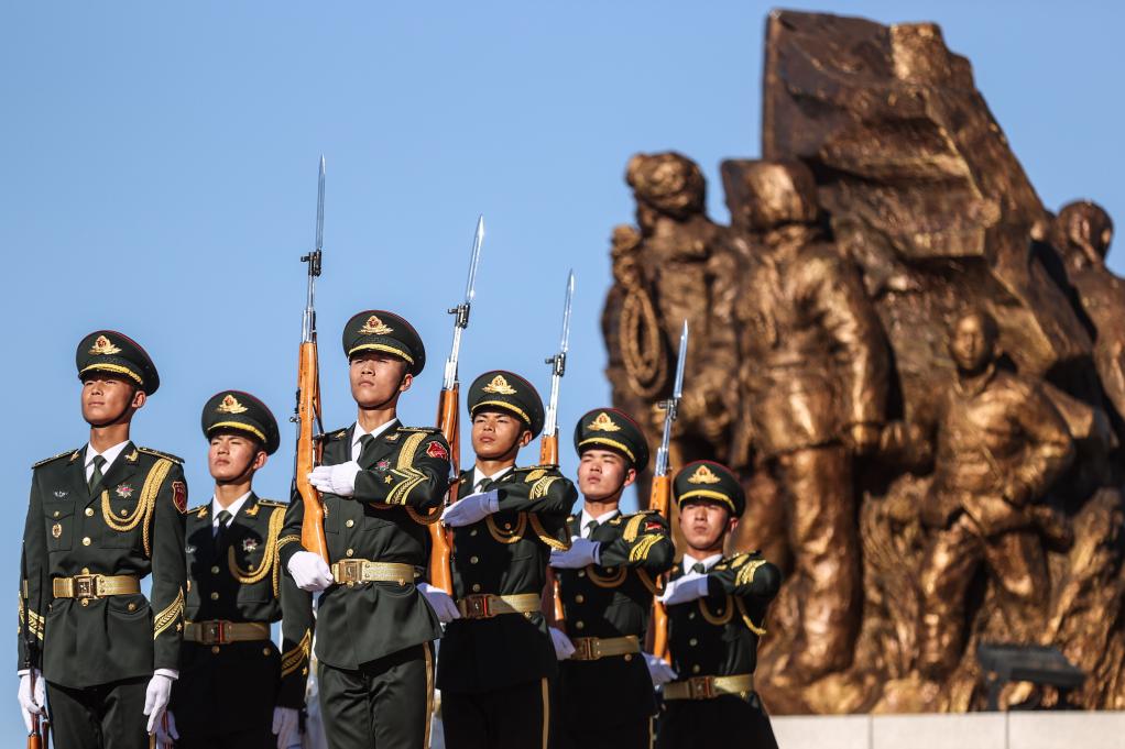 2020年10月23日,在丹東抗美援朝紀念塔敬獻花籃儀式上,禮兵在儀式中準備。
