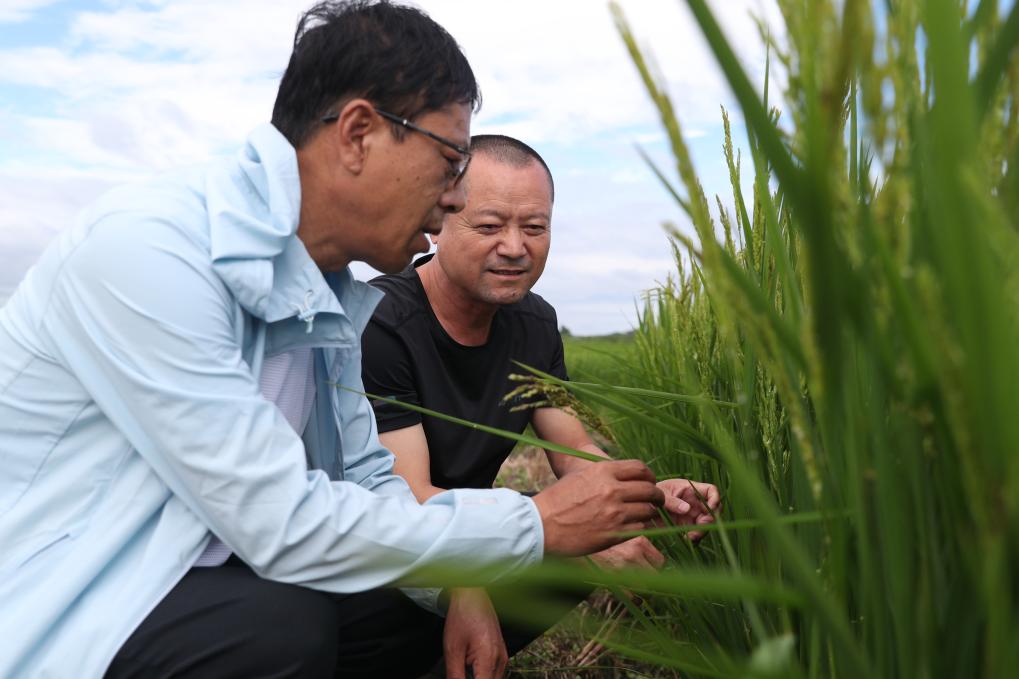 2023年8月,黑龍江省尚志市農(nóng)業(yè)技術(shù)推廣中心的工作人員在當(dāng)?shù)匾惶幈缓樗葸^(guò)的水稻田里查看水稻情況。新華社記者張濤 攝