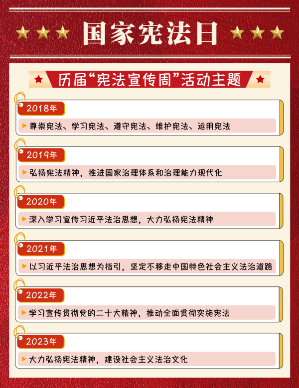 2023年12月4日是第十個國家憲法日,12月1日至7日是第六個“憲法宣傳周”,主題是“大力弘揚(yáng)憲法精神,建設(shè)社會主義法治文化”。