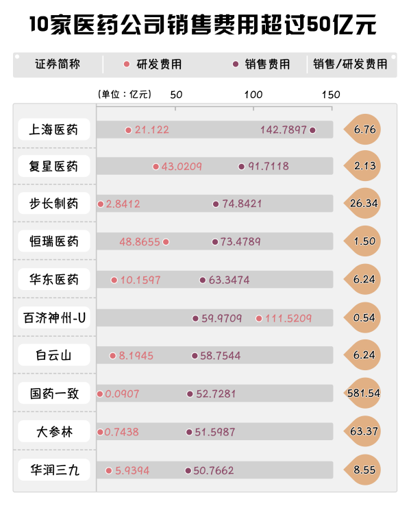 根據(jù)A股中各藥企年報中披露的數(shù)據(jù)來看,截至2022年底,共有10家藥企的銷售費用超過了50億元。整個行業(yè)中,銷售費用最高的是上海醫(yī)藥,達到了142.7897億元;復星醫(yī)藥、恒瑞醫(yī)藥、步長制藥等作為化學制藥、中藥領(lǐng)域的龍頭企業(yè),銷售費用分別達到了91.7118億元、73.4789億元以及74.8421億元。