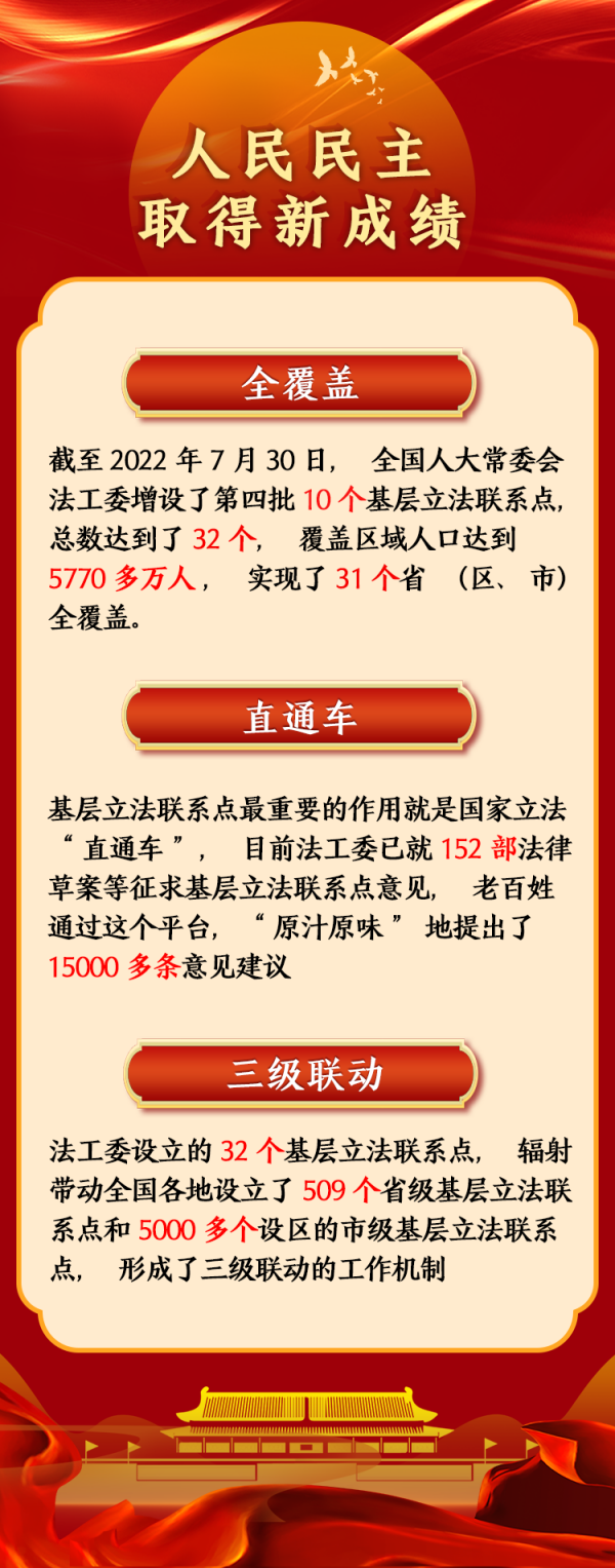 截至2022年7月30日,全國(guó)人大常委會(huì)法工委增設(shè)了第四批10個(gè)基層立法聯(lián)系點(diǎn),總數(shù)達(dá)到了32個(gè),實(shí)現(xiàn)了31個(gè)?。▍^(qū)、市)全覆蓋。32個(gè)基層立法聯(lián)系點(diǎn)覆蓋區(qū)域人口達(dá)到5770多萬(wàn)人,越來(lái)越多的老百姓在家門(mén)口就能對(duì)關(guān)切的法律問(wèn)題發(fā)表意見(jiàn)、表達(dá)訴求。
