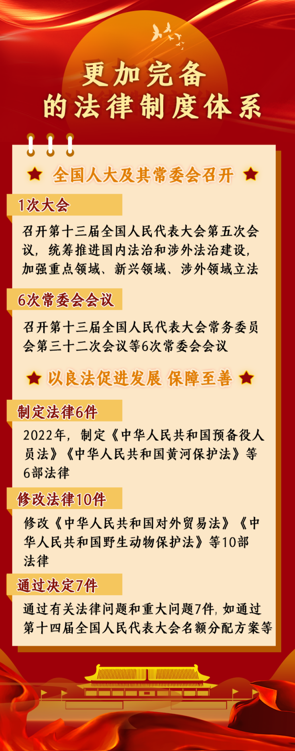 據(jù)統(tǒng)計(jì),2022年,全國(guó)人大及其常委會(huì)召開(kāi)了1次大會(huì)和6次常委會(huì)會(huì)議,統(tǒng)籌推進(jìn)國(guó)內(nèi)法治和涉外法治建設(shè),加強(qiáng)重點(diǎn)領(lǐng)域、新興領(lǐng)域、涉外領(lǐng)域立法,制定法律6件,修改法律10件次,作出法律解釋1件,通過(guò)有關(guān)法律問(wèn)題和重大問(wèn)題決定7件,法律制度體系更加完備。