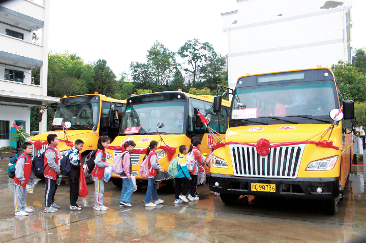 2023年9月28日,湖北省竹山縣校園直通車全域開通后,學(xué)生在有序排隊(duì)乘車。新華社發(fā)(楊娟 攝)