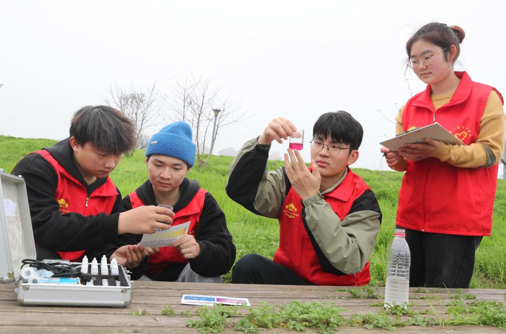 2024年3月17日,湖南省衡陽市雁峰區(qū)東洲島上,南華大學(xué)土木工程學(xué)院志愿者們?cè)跈z測(cè)湘江水質(zhì)。新華社發(fā)(曹正平攝)