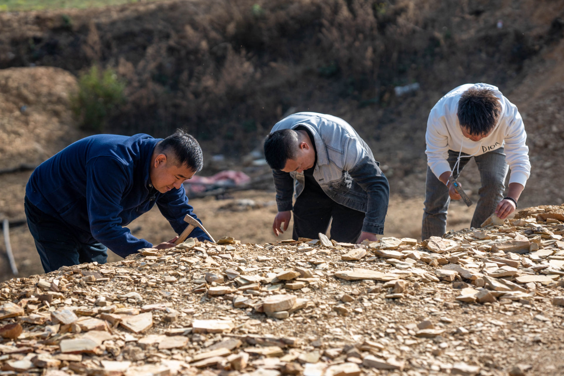 全國人大代表郭進(左一)在野外進行化石零星采集。