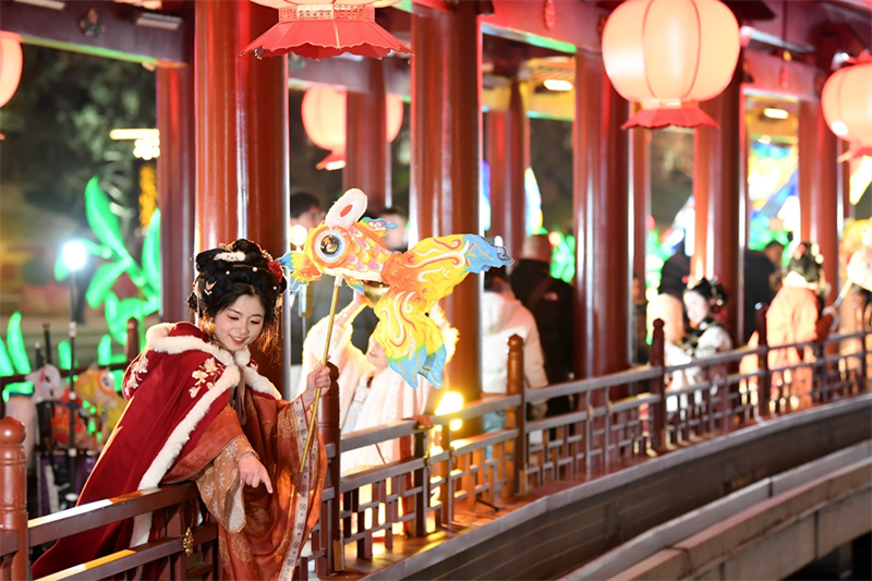 2024年2月2日,游客在西安大唐芙蓉園觀看長(zhǎng)安燈會(huì)。新華社記者 李一博 攝