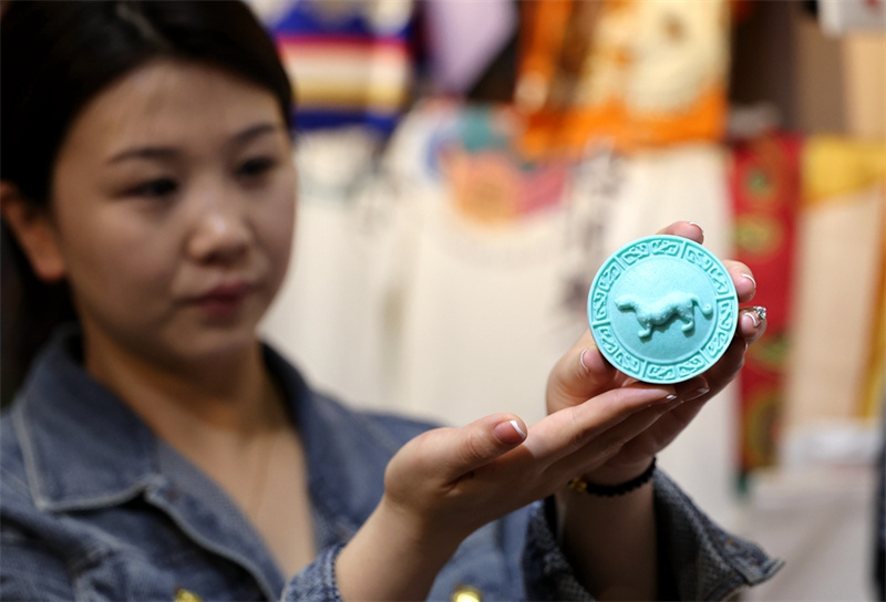 2024年4月23日,秦漢新城新絲路數(shù)字文化科技有限公司的工作人員展示一款由杜虎符開(kāi)發(fā)而成的文創(chuàng)手工皂。新華社記者 李一博 攝