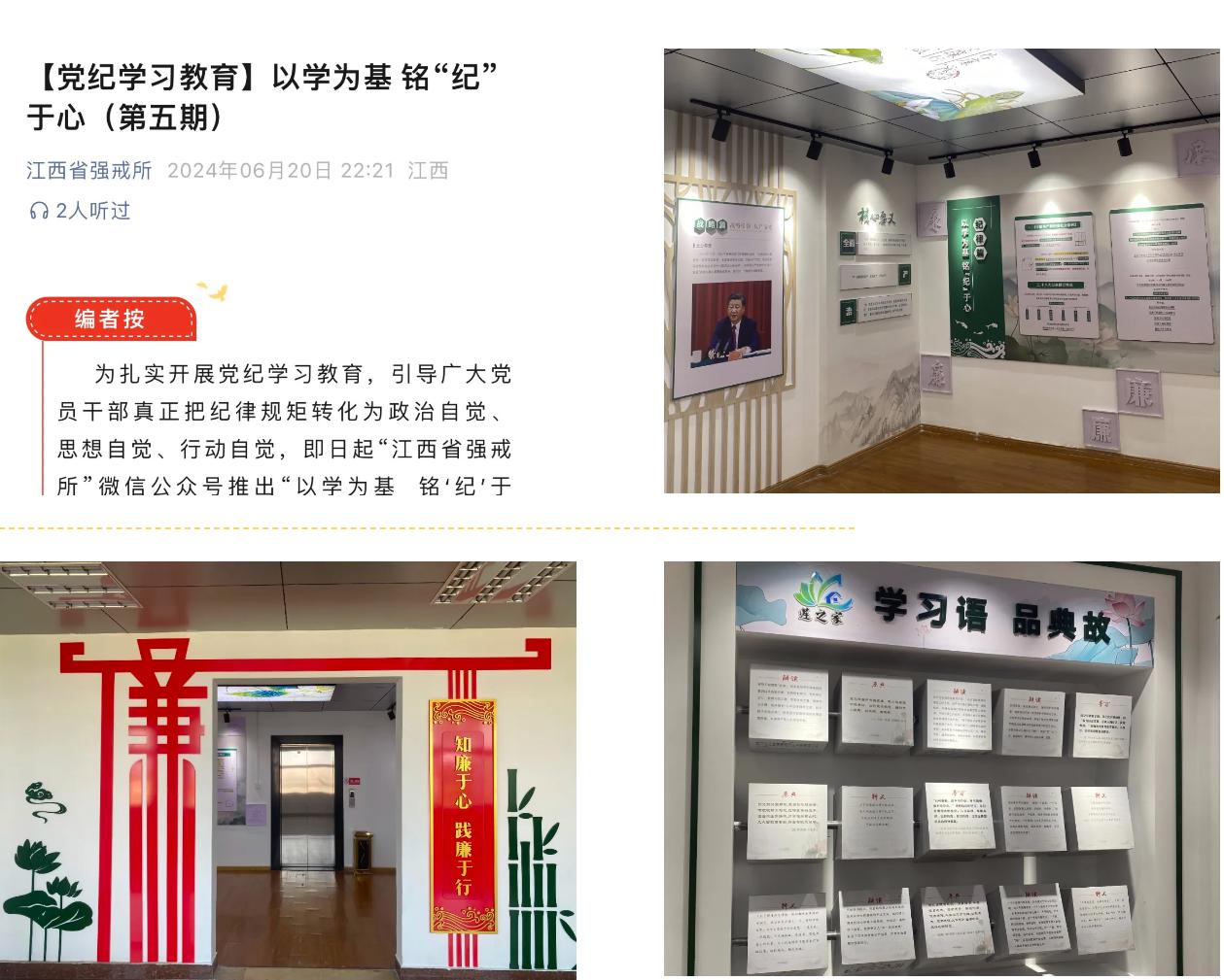 江西省強(qiáng)戒所把開(kāi)展黨紀(jì)學(xué)習(xí)教育作為重要政治任務(wù),緊盯學(xué)習(xí)重點(diǎn),拓展學(xué)習(xí)形式,注重學(xué)用結(jié)合。依托所微信公眾號(hào)、所內(nèi)網(wǎng)、LED顯示屏等媒介推送黨紀(jì)知識(shí),開(kāi)設(shè)“以學(xué)為基 銘‘紀(jì)’于心”、黨紀(jì)學(xué)習(xí)教育專欄等;綜合運(yùn)用圖文、音頻、視頻等形式,通過(guò)講、寫、學(xué)、測(cè)等方式展現(xiàn)學(xué)習(xí)教育成效,構(gòu)建全方位宣傳矩陣,營(yíng)造全員參與、人人學(xué)紀(jì)的濃厚氛圍。