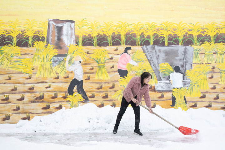黑龍江省漠河市北極鎮(zhèn)北紅村“遠(yuǎn)方故里”民宿負(fù)責(zé)人張翠花在清理積雪(2023年1月12日攝)。新華社記者 張濤 攝