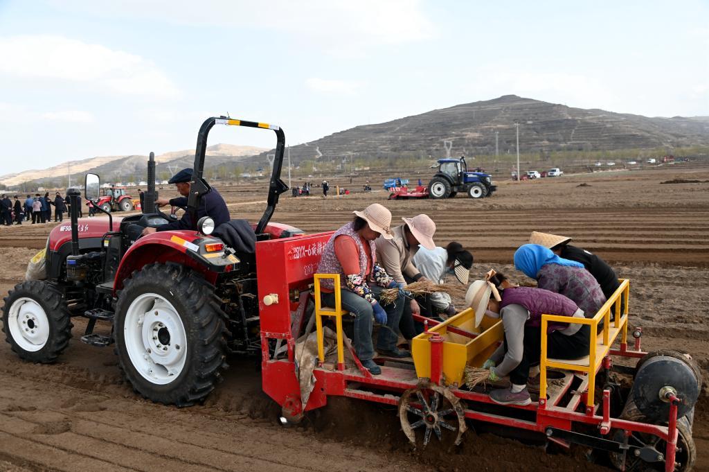 2024年春,在隴西縣一處中藥材生產(chǎn)基地,中藥材移栽機(jī)在作業(yè)。(崔翔龍 攝)