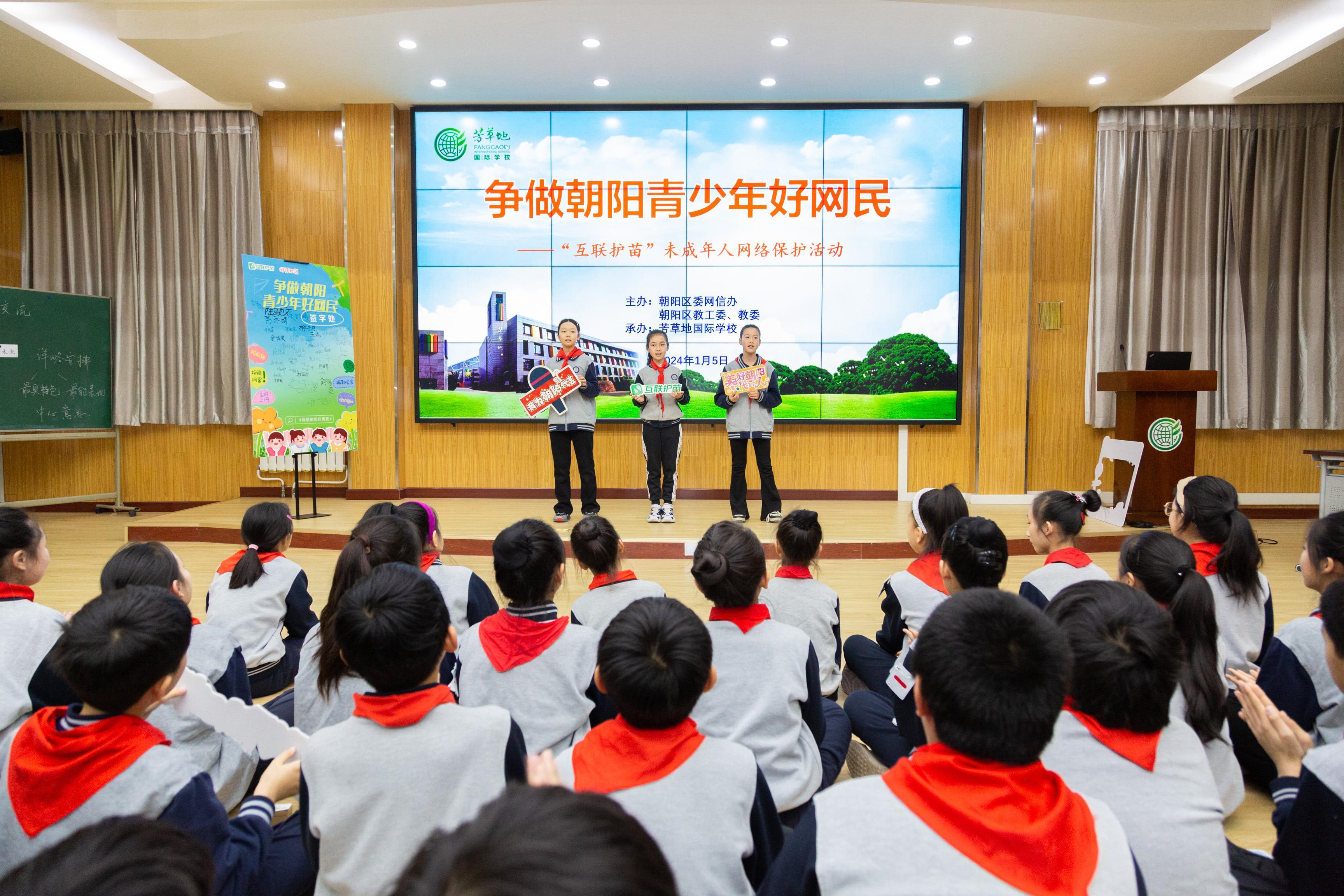 1月5日,北京市朝陽區(qū)委網(wǎng)信辦聯(lián)合朝陽區(qū)教工委、教委走進(jìn)芳草地國際學(xué)校舉辦“爭做朝陽青少年好網(wǎng)民——‘互聯(lián)護(hù)苗’未成年人網(wǎng)絡(luò)保護(hù)”主題活動(dòng)。