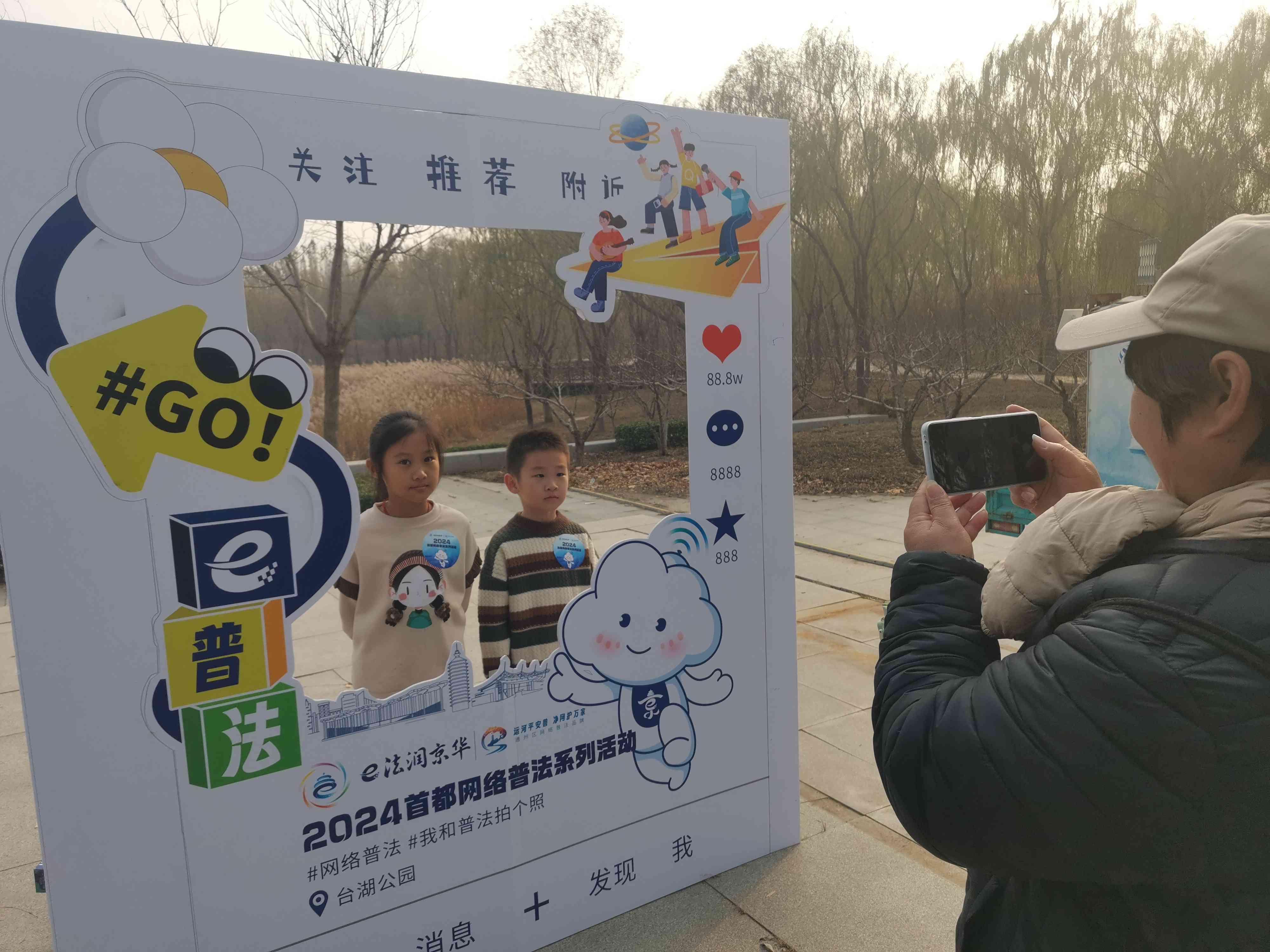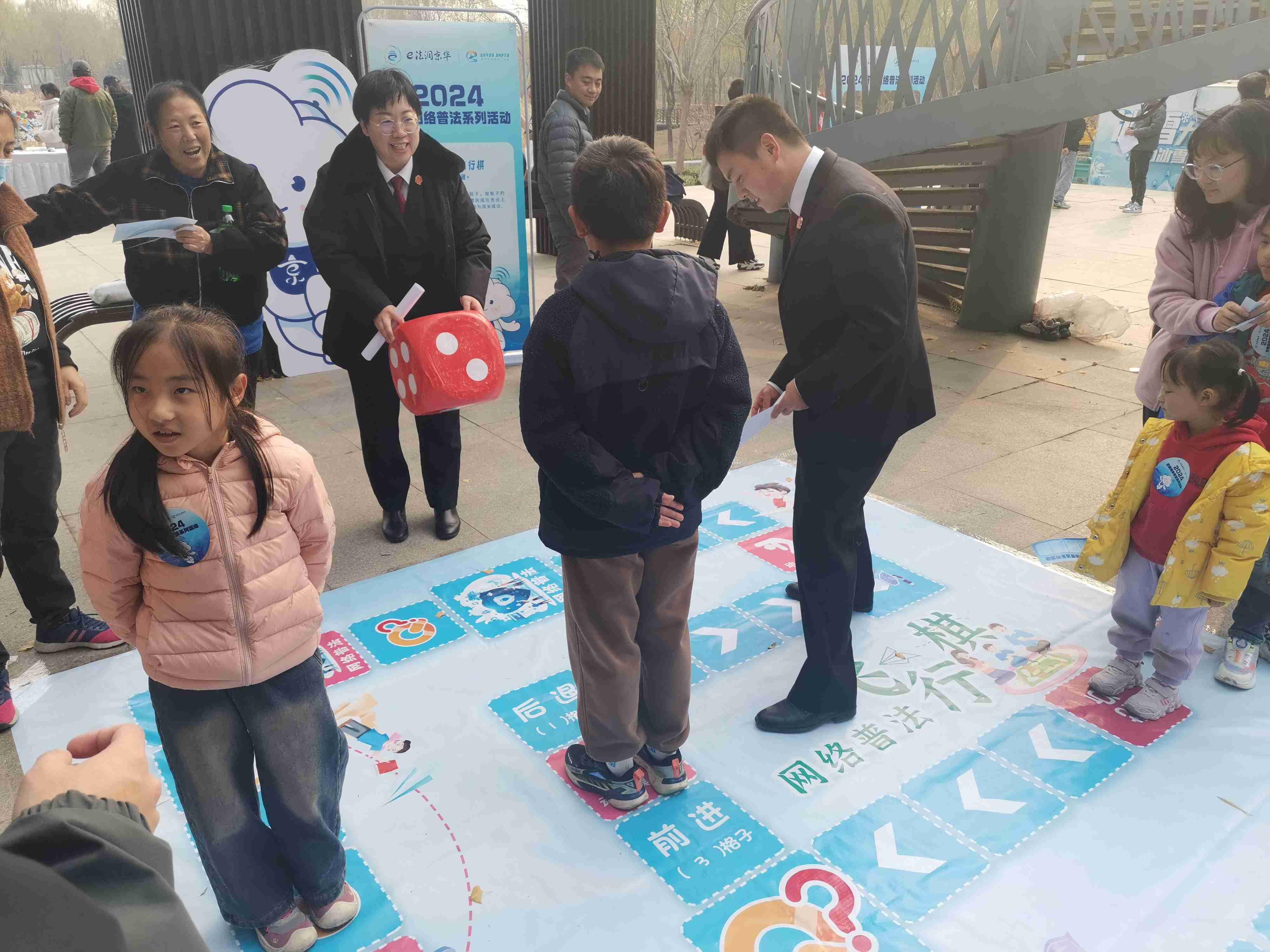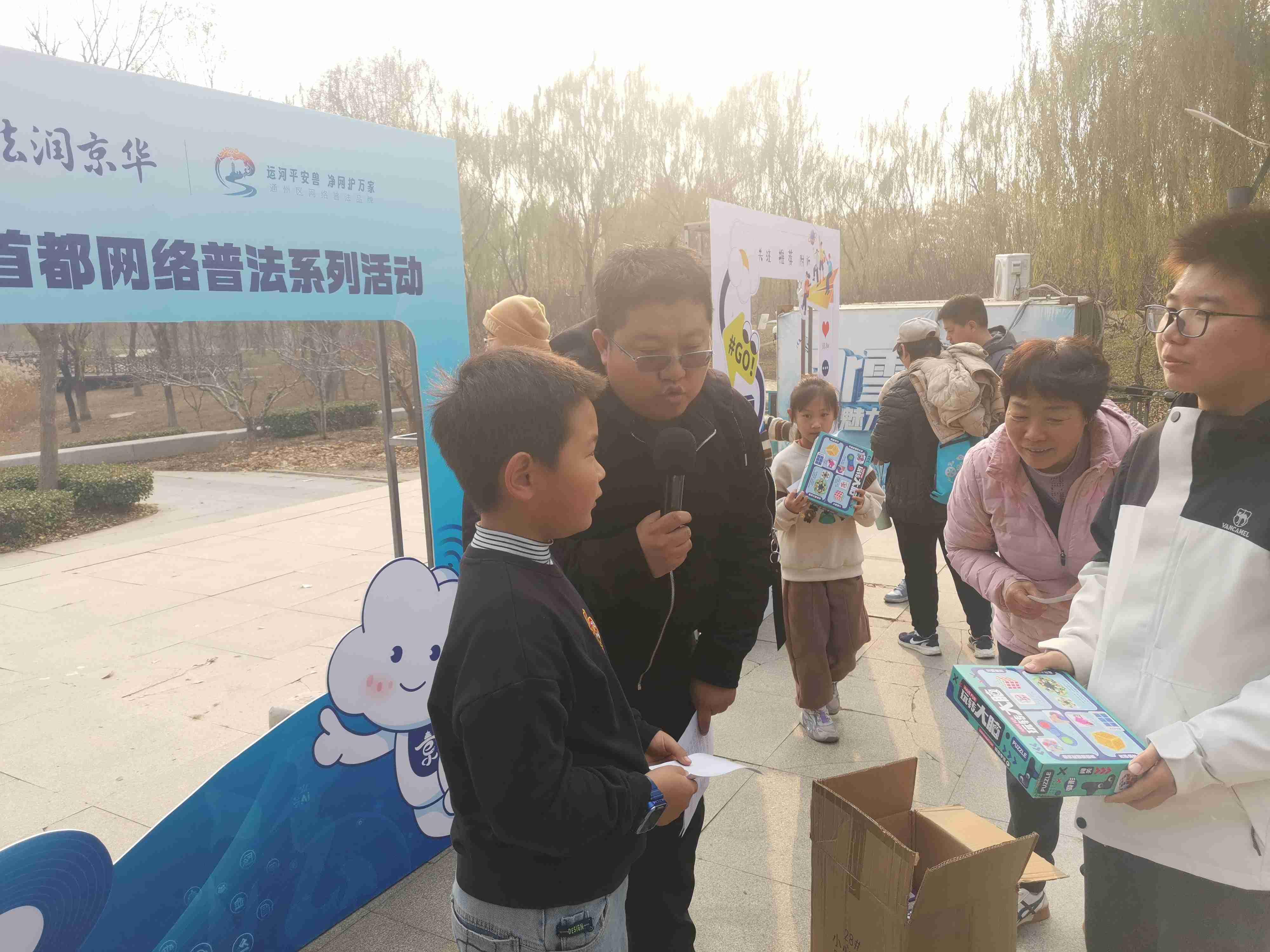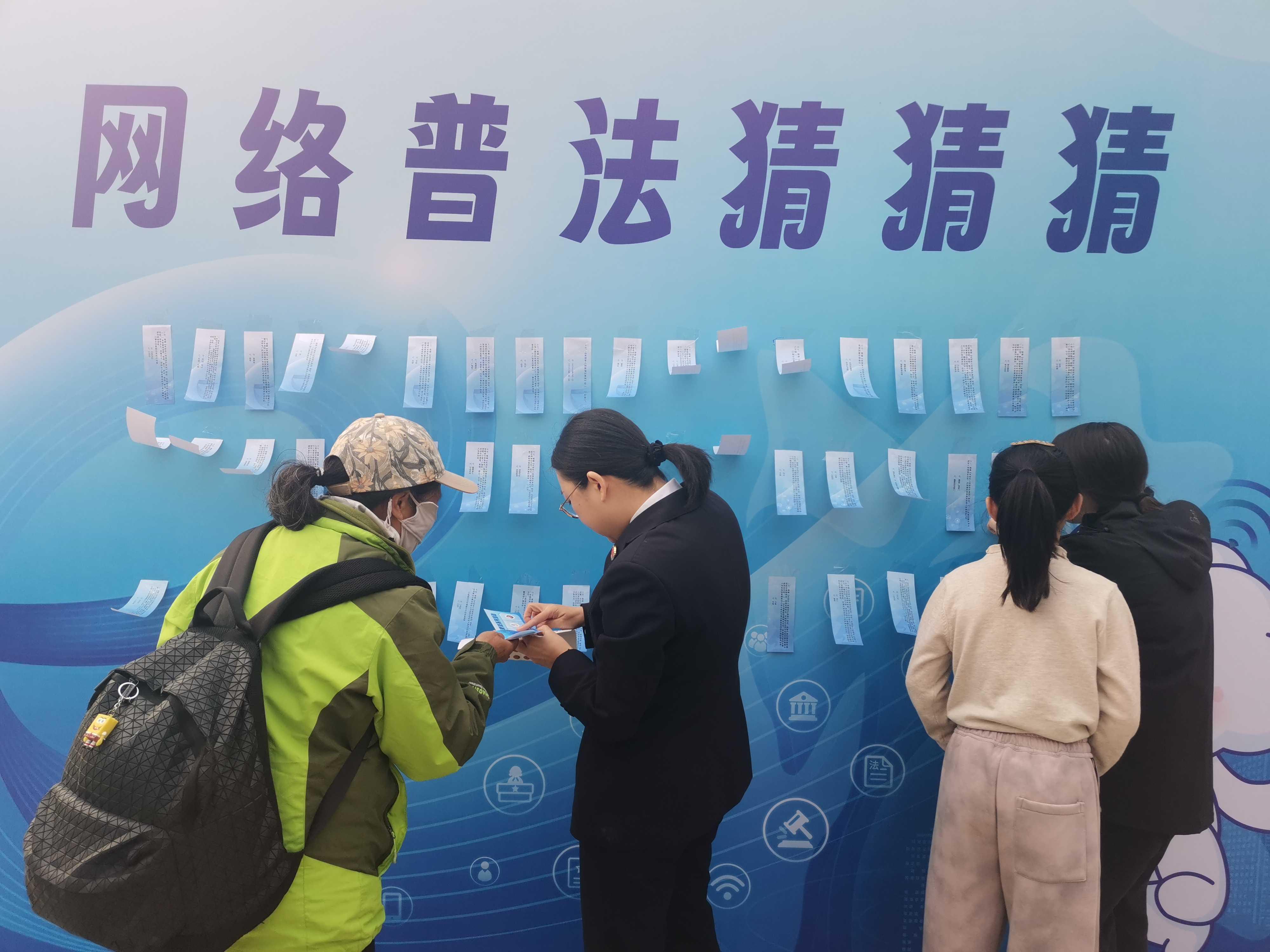猜謎語、繪圖畫、拼拼圖、玩游戲……11月9日下午,北京市通州區(qū)臺(tái)湖公園內(nèi)人聲鼎沸、熱鬧非凡,由北京市委網(wǎng)信辦主辦,通州區(qū)委網(wǎng)信辦承辦,通州區(qū)人民法院、通州區(qū)人民檢察院、通州區(qū)教委以及臺(tái)湖鎮(zhèn)人民政府協(xié)辦的“e法潤京華·運(yùn)河平安獸 護(hù)網(wǎng)凈萬家”網(wǎng)絡(luò)普法游園會(huì)正如火如荼地進(jìn)行。記者在現(xiàn)場看到,人們駐足觀看普法短劇并爭相和劇中的小主人公合影、在普法展板前聽檢察官以案講法、在網(wǎng)絡(luò)普法像框墻前打卡留念,在手繪布上畫下對網(wǎng)絡(luò)安全和文明上網(wǎng)的理解與期盼。而現(xiàn)場設(shè)置的網(wǎng)絡(luò)普法猜猜猜、普法拼圖大挑戰(zhàn)、網(wǎng)絡(luò)普法飛行棋等闖關(guān)游戲更是引起眾多小朋友的興趣和熱情,每個(gè)游戲區(qū)前都排起了長隊(duì),在歡聲笑語中,針對未成年人的網(wǎng)絡(luò)保護(hù)知識(shí)也在孩子們心中扎根發(fā)芽。