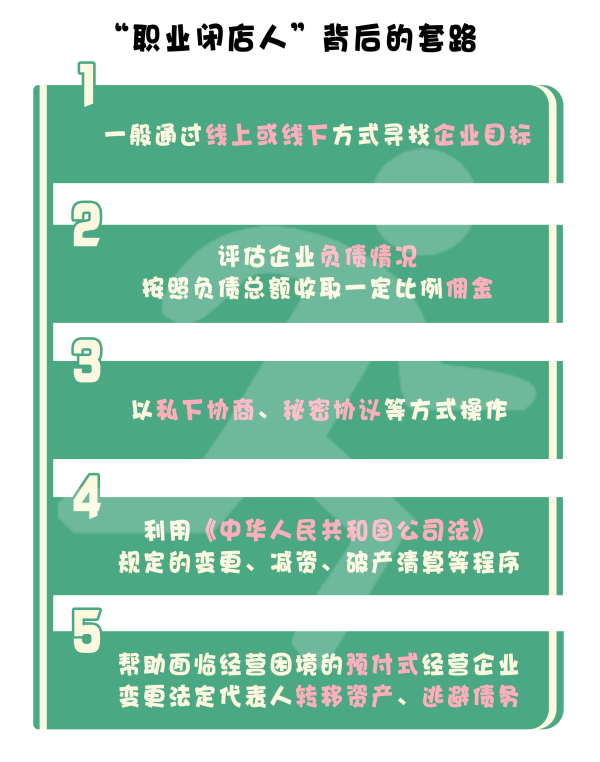 一些中介、機(jī)構(gòu)或者個(gè)人,通過(guò)熟人介紹、自行尋找、在社交平臺(tái)發(fā)布“收負(fù)數(shù)店鋪”相關(guān)帖文等方式,與負(fù)債或者經(jīng)營(yíng)困難的預(yù)付式企業(yè)取得聯(lián)系并建立合作關(guān)系,評(píng)估企業(yè)負(fù)債情況收取傭金,利用法律程序?qū)ⅰ奥殬I(yè)閉店人”變更為新的法定代表人,協(xié)助負(fù)債或者經(jīng)營(yíng)不善的企業(yè)跑路。與此同時(shí),被欺騙的消費(fèi)者只能看著“一地雞毛”暗自神傷,礙于維權(quán)困難只能默默吞下苦果。