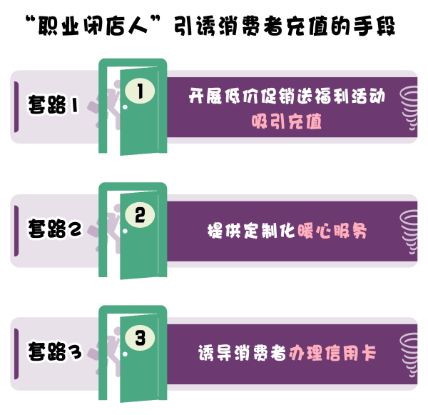 為了讓消費(fèi)者掏錢,“職業(yè)閉店人”們可謂無(wú)所不用其極:一是打出“開業(yè)促銷送福利”的口號(hào),以優(yōu)惠的價(jià)格引誘消費(fèi)者充值。二是提供“定制化暖心服務(wù)”,培訓(xùn)銷售、教練為不同年齡層、不同性別消費(fèi)的者提供情緒價(jià)值,以貼心舉動(dòng)引誘消費(fèi)者充值。三是推出信用卡特惠充值活動(dòng),“職業(yè)閉店人”通過(guò)勸說(shuō)消費(fèi)者參加店鋪與銀行的聯(lián)名活動(dòng),讓消費(fèi)者辦理信用卡,隨后告知消費(fèi)者凍結(jié)信用卡便可升級(jí)會(huì)員,在消費(fèi)者凍結(jié)信用卡后刷卡提現(xiàn)。