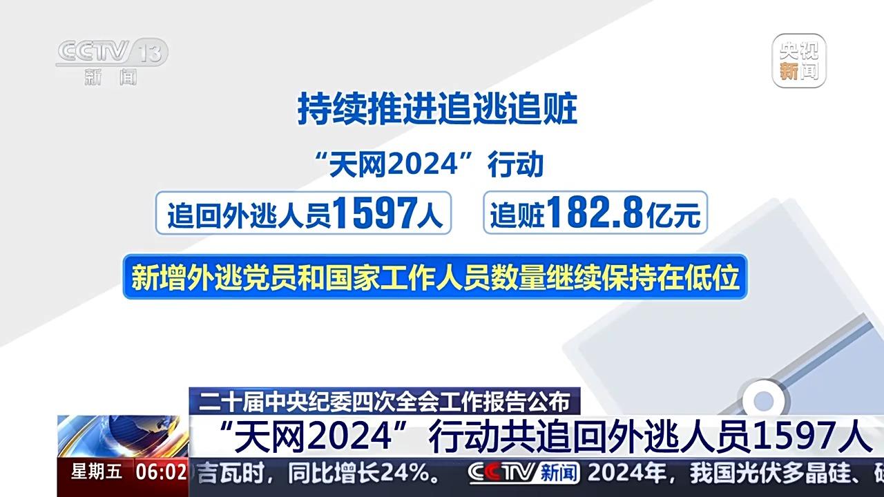 境內(nèi)打“虎”拍“蠅”,境外獵狐不停,紀(jì)檢監(jiān)察機(jī)關(guān)開展境外腐敗問題專項(xiàng)治理,立案查處跨境腐敗案件360件,挽回?fù)p失322億元;持續(xù)推進(jìn)追逃追贓,“天網(wǎng)2024”行動(dòng)共追回外逃人員1597人,追贓182.8億元,新增外逃黨員和國家工作人員數(shù)量繼續(xù)保持在低位。