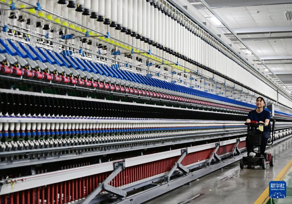 ??即墨區(qū)一家智慧紡紗企業(yè)的職工駕駛代步車巡檢自動(dòng)化超長細(xì)紗生產(chǎn)線(3月25日攝)。