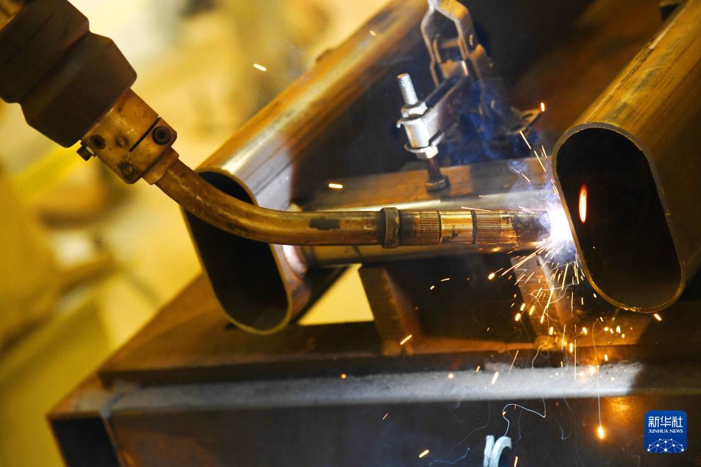 青島英派斯健康科技股份有限公司智慧工廠內(nèi)的自動激光焊接機器人在作業(yè)(4月22日攝)。