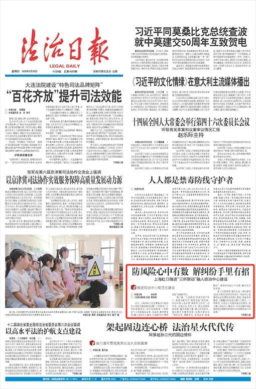 不久前,上海北外灘國(guó)際法律服務(wù)港正式“開(kāi)港”,一起標(biāo)的額近10億元的破產(chǎn)衍生案成功調(diào)解。虹口區(qū)司法局黨委書記、局長(zhǎng)王琳說(shuō):“服務(wù)港‘開(kāi)港’,標(biāo)志著虹口的法律服務(wù)資源,尤其是涉外法治資源得到進(jìn)一步整合,服務(wù)能級(jí)進(jìn)一步提升?!睋?jù)悉,近年來(lái)虹口區(qū)圍繞“三所聯(lián)動(dòng)”,持續(xù)整合各類法治資源,在綜治中心和“三所聯(lián)動(dòng)”之間形成雙向賦能的良好局面。