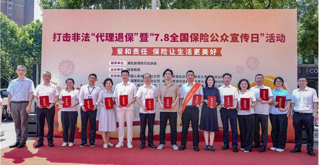 活動現(xiàn)場,大家人壽湖北分公司代表與12家金融機構(gòu)代表聯(lián)合發(fā)起倡議,鄭重宣讀《打擊非法代理退保承諾書》,展現(xiàn)行業(yè)堅決打擊非法“代理退?!焙诨耶a(chǎn)的決心。國家金融監(jiān)督管理總局湖北監(jiān)管局、湖北省保險行業(yè)協(xié)會和極目新聞相關(guān)領(lǐng)導(dǎo)共同為現(xiàn)場保險公司頒發(fā)“打擊非法‘代理退保’先鋒單位”榮譽證書,倡議行業(yè)助力保險消費者守護好“錢袋子”。