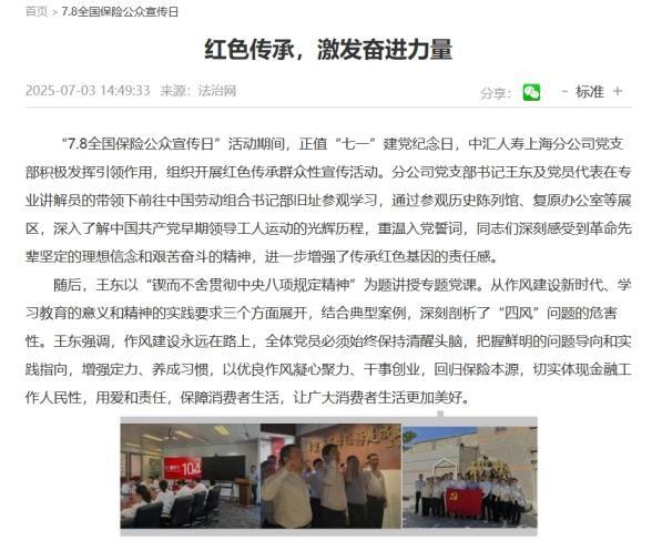 積極與外部媒體溝通合作,投稿文案、視頻等宣傳素材。在財經(jīng)網(wǎng)、法治日報、搜狐網(wǎng)、新浪網(wǎng)等平臺發(fā)表多篇關(guān)于公司在“7.8全國保險公眾宣傳日”活動期間的報道,內(nèi)容涵蓋公司的各項活動舉措、風(fēng)險提示文章、紅色傳承活動、公益活動成果等。