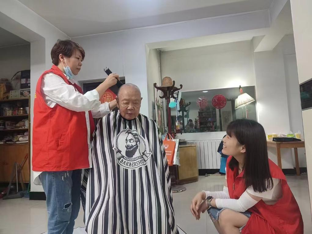 西安市碑林區(qū)黃雁社區(qū)的工作人員和志愿者上門為留守老人提供剪發(fā)服務。(受訪者供圖)
