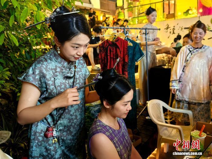 8月23日晚,福州煙臺(tái)山歷史風(fēng)貌區(qū)的街巷熙熙攘攘,游客摩肩接踵。在鹽倉(cāng)的三條簪非遺體驗(yàn)現(xiàn)場(chǎng),工作人員正在給一位女孩邊梳妝邊講解頭飾背后的文化寓意,不少路過(guò)的游客圍攏觀看,有的女孩也在一旁躍躍欲試。