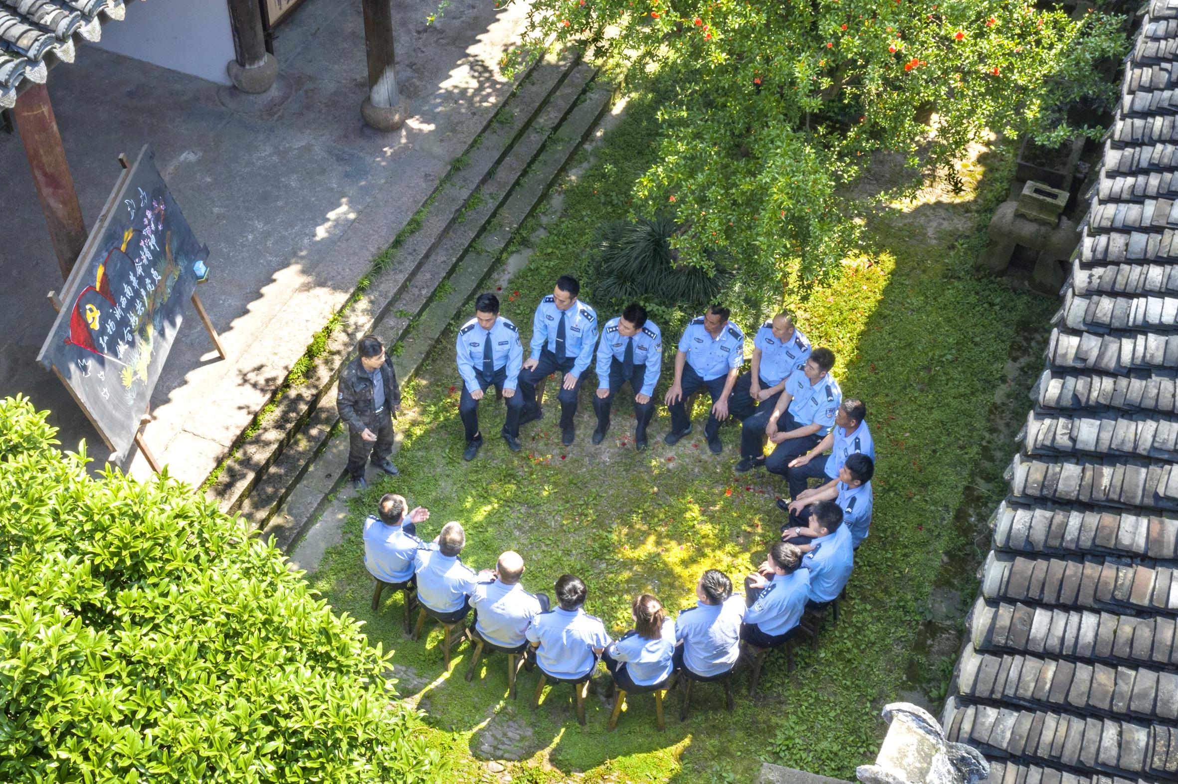 浙江省麗水市縉云縣壺鎮(zhèn)派出所民警在中共縉云一大會(huì)址(燕翼小學(xué))聽(tīng)老黨員講述縉云早期黨組織的發(fā)展歷程和紅色戰(zhàn)斗史。 章勛 攝