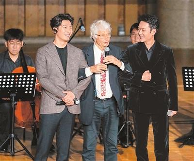 電影《狼圖騰》導(dǎo)演讓-雅克·阿諾(前排左二)與中國演員馮紹峰(前排右一)、竇驍在“光影百年·中法同行”電影音樂會上互動。 新華社記者 謝晗攝