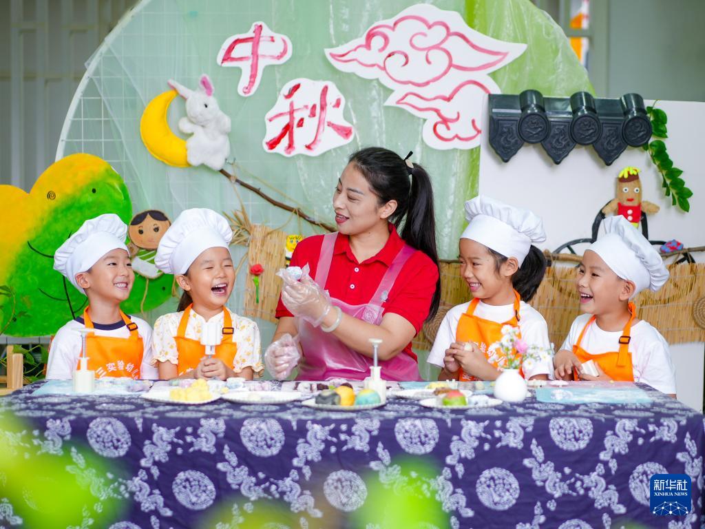 9月25日,在江蘇省泰州市姜堰區(qū)第三實(shí)驗(yàn)幼兒園,小朋友們?cè)诶蠋煹闹笇?dǎo)下學(xué)習(xí)做月餅。